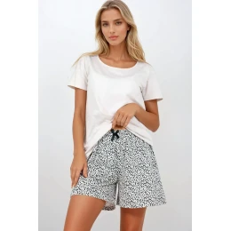 Dámský pyžamový set s elegantním a pohodlným střihem, navržený s ohledem na pohodlí a styl. Dvoudílná sada se skládá z trička s krátkým rukávem a výstřihem typu U a kalhotek s pohodlnou gumou v pasu. Volný, přizpůsobivý střih zajistí volnost pohybu a skvěle padne na postavu. Vyrobeno z měkké, prodyšné látky vysoké kvality, která je příjemná k pokožce a ideální na teplé noci. Moderní barevné provedení a elegantní stylování dělají z tohoto pyžama skvělý kousek i na domácí nošení. Produkt navržený a ušitý v Polsku, spojení kvality, pohodlí a moderního designu.