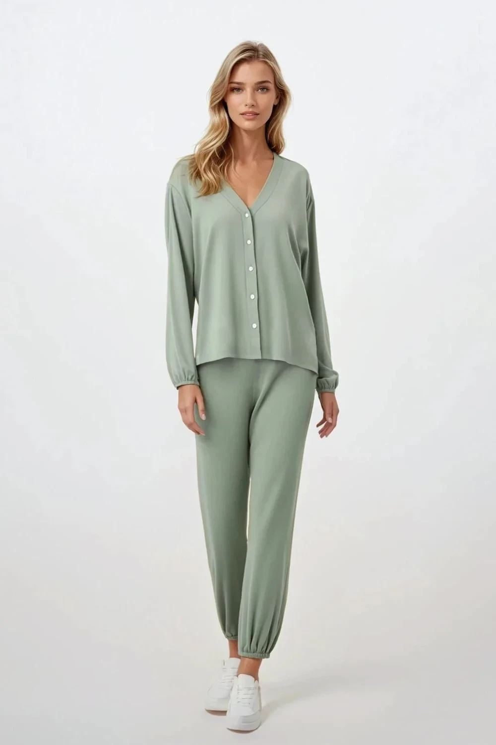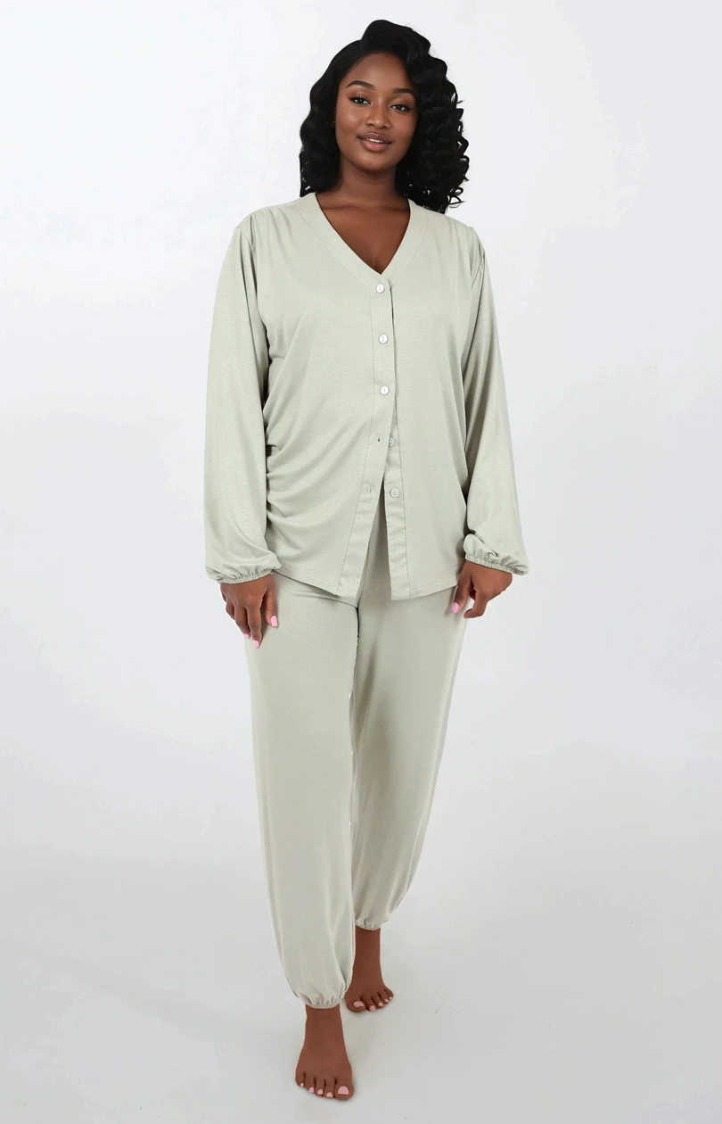 Elegantní dámské pyžamo s ženským a pohodlným střihem, ideální jak pro spaní, tak i jako stylové oblečení na doma. Dvoudílná sada se skládá z košile s dlouhým rukávem, zapínající se na knoflíky, s výstřihem do špičky a decentní, jemnou barevností. Rukávy jsou zakončeny měkkým lemem, který zajistí pohodlí a praktičnost, zejména v chladnějších dnech. Dlouhé kalhoty s širší nohavicí a elastickým pásem zaručují volnost pohybu a ideální přizpůsobení. Vyrobena z jemné, prodyšné viskózy, pyžamo je přátelské k pokožce a skvěle se hodí i pro ženy s větším poprsím. Navrženo a ušito v Polsku, skvělá volba jako dárek nebo jako každodenní, stylové noční prádlo.