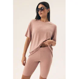Pohodlný a stylový dámský pyžamo, ideální jak k spaní, tak jako pohodlné domácí oblečení. Vyrobeno z měkkého, prodyšného pleteného materiálu s proužkovanou strukturou, poskytuje plnou volnost pohybu a dokonalé přizpůsobení tělu. Horní část pyžama má volný střih a polokruhový výstřih, díky čemu skvěle padne na postavě a neomezuje pohyb. Legíny sahající před kolena mají široký elastický pas, co zaručuje pohodlné a stabilní přizpůsobení. Sada se skvěle hodí nejen jako pyžamo, ale také jako domácí oděv na lenivá rána nebo relaxační večery. Celý set je balen v praktické fóliové tašce.