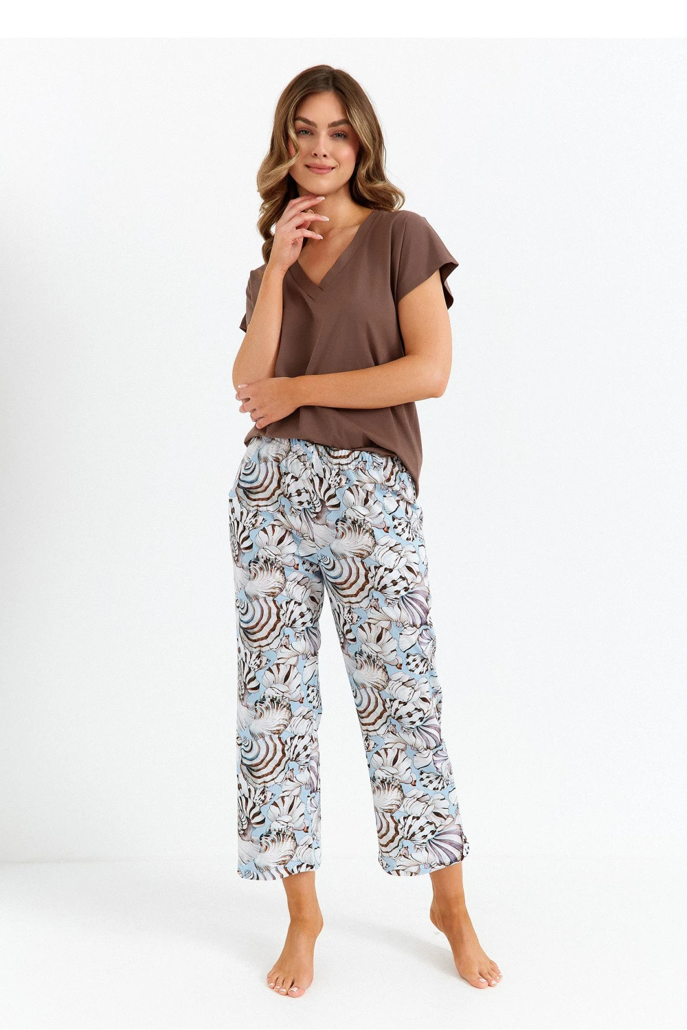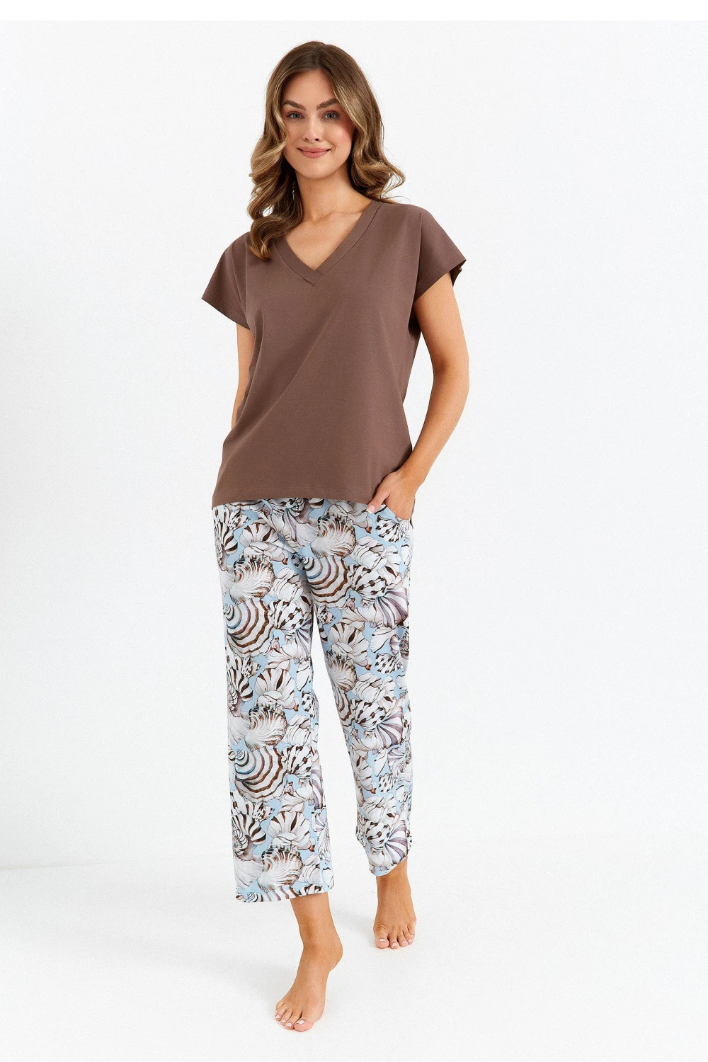 Moderní a pohodlný dámský pyžamo navržené s ohledem na každodenní pohodlí. Tričko s krátkým rukávem a výstřihem ve tvaru písmene V decentně zdůrazňuje ženskou siluetu a volný střih zajišťuje plnou volnost pohybu. Model je vybaven praktickými kapsami, které přidávají funkčnost. Součástí jsou kalhoty s délkou 7/8 s efektním potiskem. Elastický pás zaručuje ideální přiléhání a pohodlí při nošení. To je skvělá volba pro ženy, které ocení kombinaci stylu a pohodlí.