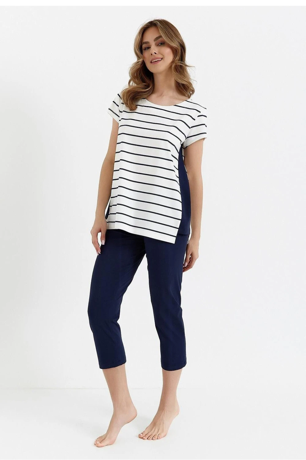 Klasický a pohodlný dámský pyžamový set, ideální na teplejší noci. Tričko s krátkým rukávem a polokolem výstřihu poskytuje volnost pohybu a pohodlí při nošení. Jednoduchý, nadčasový střih se hodí jak k spaní, tak k relaxaci doma. Kalhoty typu 3/4 bez kapes mají elastický pásek, který zajišťuje ideální přizpůsobení postavě. Celý set je zabalený v praktickém fóliovém pytli, skvělý i jako dárek.