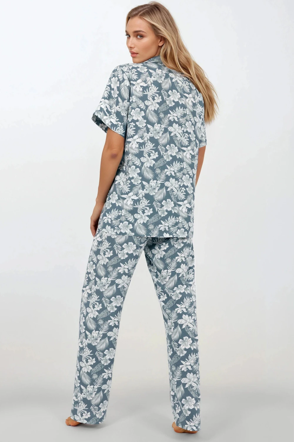 Elegantní dvoudílný dámský pyžamový set s klasickým střihem je kombinací stylu, pohodlí a vysoké kvality zpracování. Horní část je košile s krátkým rukávem, s klasickým límcem a zapínáním na knoflíky, co jí dodává velmi elegantní charakter. Výstřih do špičky decentně zdůrazňuje ženskou siluetu a jemná barevnost dotváří celkový, elegantní vzhled. Rukávy s manžetami přidávají stylový akcent a volný, elegantní střih zaručuje volnost pohybu a pohodlí během celé noci. Spodní část setu jsou dlouhé kalhoty s přímými nohavicemi a elastickým pásem, který zajišťuje perfektní přizpůsobení bez tlaku. Pyžamo je vyrobeno z měkké, prodyšné a jemné viskózové látky, která je příjemná na kůži a skvěle se hodí bez ohledu na roční období. Vysoká kvalita potisku látky a pečlivé zpracování zaručují dlouhotrvající estetiku. Navrženo a ušito v Polsku, je ideální i jako dárek a skvělou volbou pro ženy, které oceňují eleganci, pohodlí a kvalitu.