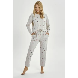 Klasický ženský pyžamový set ideální na chladné večery a rána. Tričko s dlouhým rukávem a kulatým výstřihem je vyrobeno z měkké, prodyšné látky, která jemně obklopuje tělo a poskytuje pohodlí po celou noc. Dlouhé kalhoty s decentním vzorem mají praktické kapsy, široký elastický pás a šňůrky, které umožňují perfektní přizpůsobení postavě. Celý set je zabaleno do fóliové tašky, skvělá volba jak na každý den, tak jako dárek. Bavlna 98 %