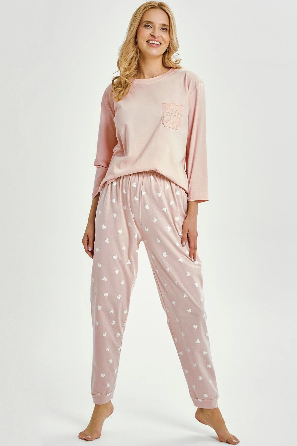 Elegantní a funkční dámská pyžama, která spojuje pohodlí s jemnou elegancí. Košile s 7/8 rukávem a polokruhovým výstřihem skvěle padne na postavě a praktická kapsa na hrudi přidává šarmu a funkčnosti. Volný střih zaručuje pohodlí po celou noc. Dlouhé kalhoty s trendy potiskem jsou zakončeny upínacími pásky na spodku nohavic, co zajistí ideální přizpůsobení. Elastický pás s gumičkou zvyšuje pohodlí nošení. Celá souprava je balena do fóliové taštičky, skvělá jak pro sebe, tak jako dárek.