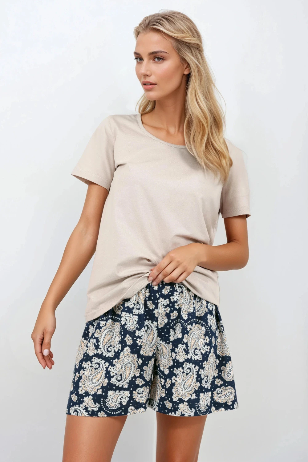 Dámský pyžamový set s certifikátem OEKO-TEX Standard 100, vyrobený z přírodních, hypoalergenních materiálů, které poskytují pohodlí a bezpečí citlivé pokožce. Dvoudílný set se skládá z volného vrchního dílu s polokruhovým výstřihem a krátkým rukávem a elegantních kalhot s módním potiskem a elastickým pasem pro ideální přizpůsobení. Ženský styl a elegantní design dělají pyžamu dokonalým spojením pohodlí a estetiky. Polský produkt, navržený a ušitý s důrazem na vysokou kvalitu tisku a detailů.