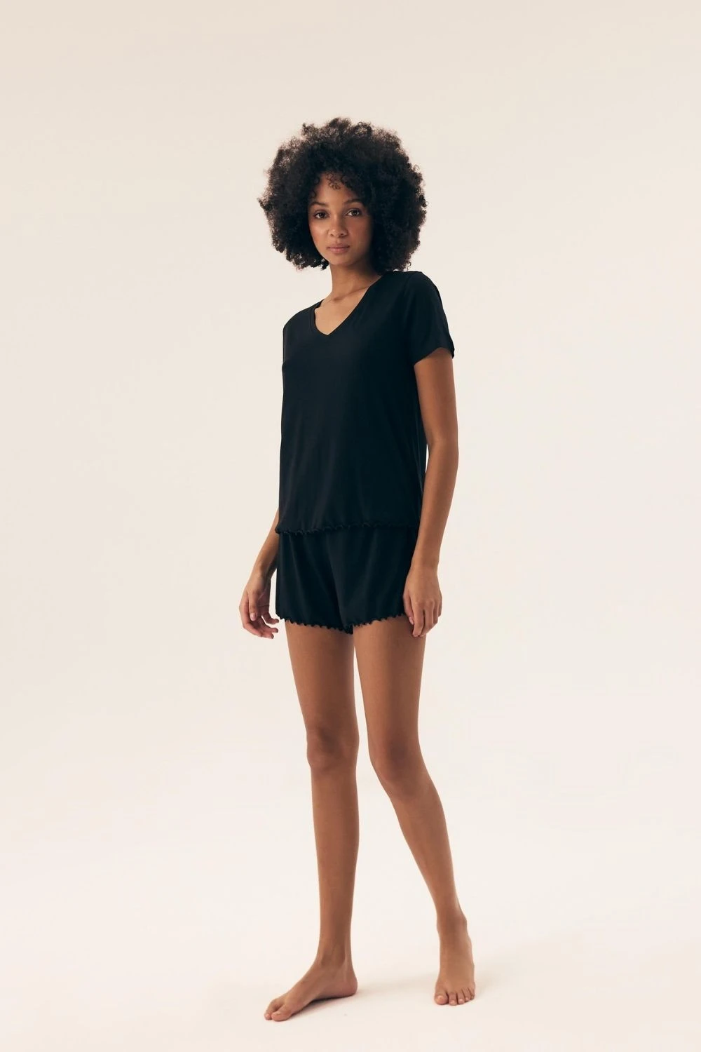 Elegantní dámské pyžamo vyrobené z jemné viskózy poskytuje pohodlný spánek po celou noc. Tričko s krátkým rukávem a V výstřihem je zdobeno decentním lemováním dole, skvěle ladí s krátkými šortkami, které mají široký gumový pás pro ještě větší pohodlí. Hladká látka dělá pyžamu příjemnou na dotek, ideální na teplé noci. Produkt je dodáván v praktickém fóliovém sáčku, skvělý i jako dárek.