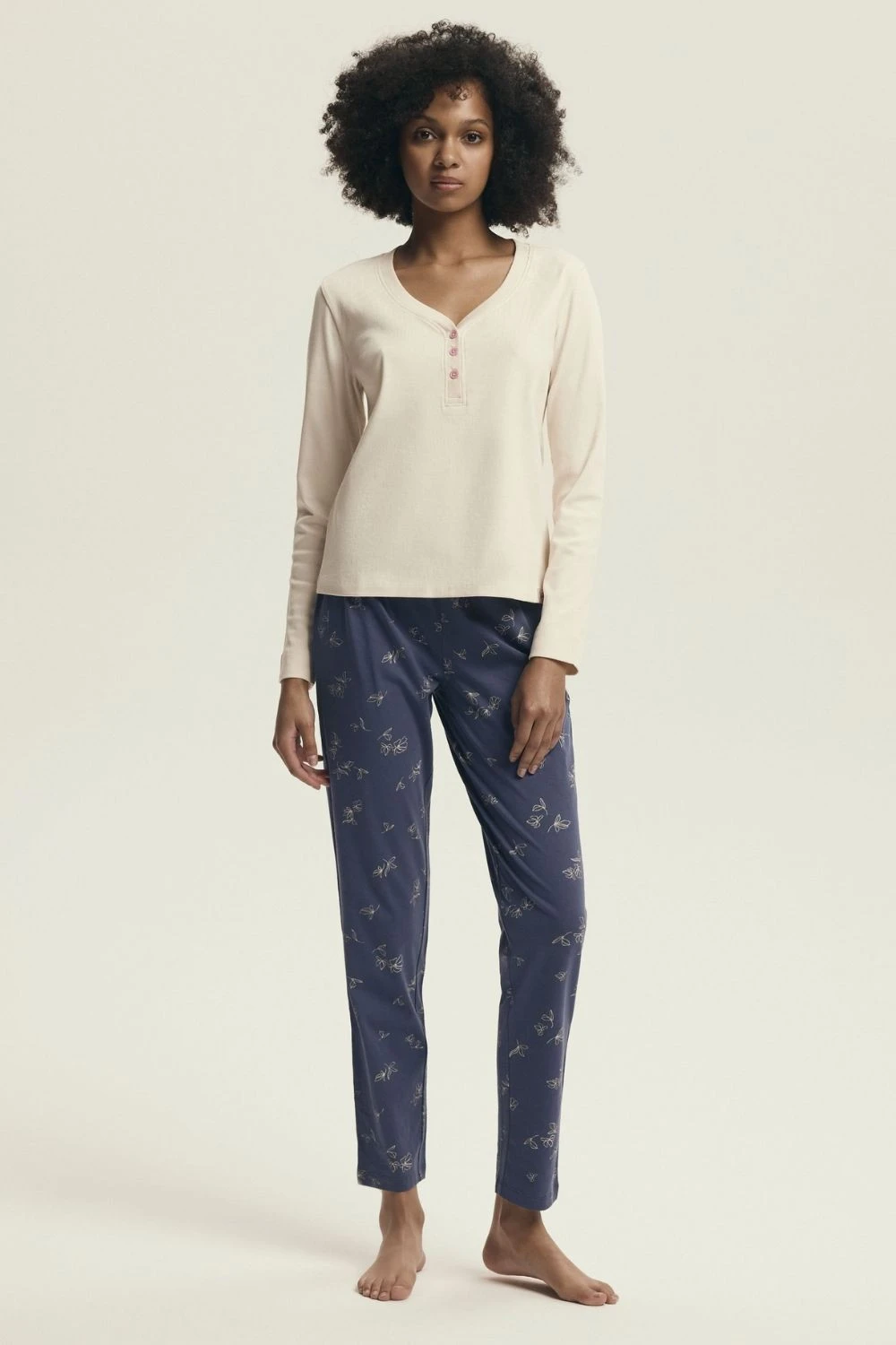 Dámský noční košil s klasickým a zároveň ženským střihem, vyrobený z měkké a prodyšné látky, která zajistí výjimečný komfort při spaní. Košile s dlouhým rukávem má výstřih ve tvaru písmene V a tři knoflíky, což jí dodává jemný šarm a funkčnost. Dlouhé kalhoty s jemným potiskem mají široký, elastický pásek, díky čemuž se ideálně přizpůsobují postavě, aniž by škrtily. Celý kus je zabalen do praktického fóliového sáčku, skvělá volba na každý den nebo jako pohodlná noční košile na cesty.
