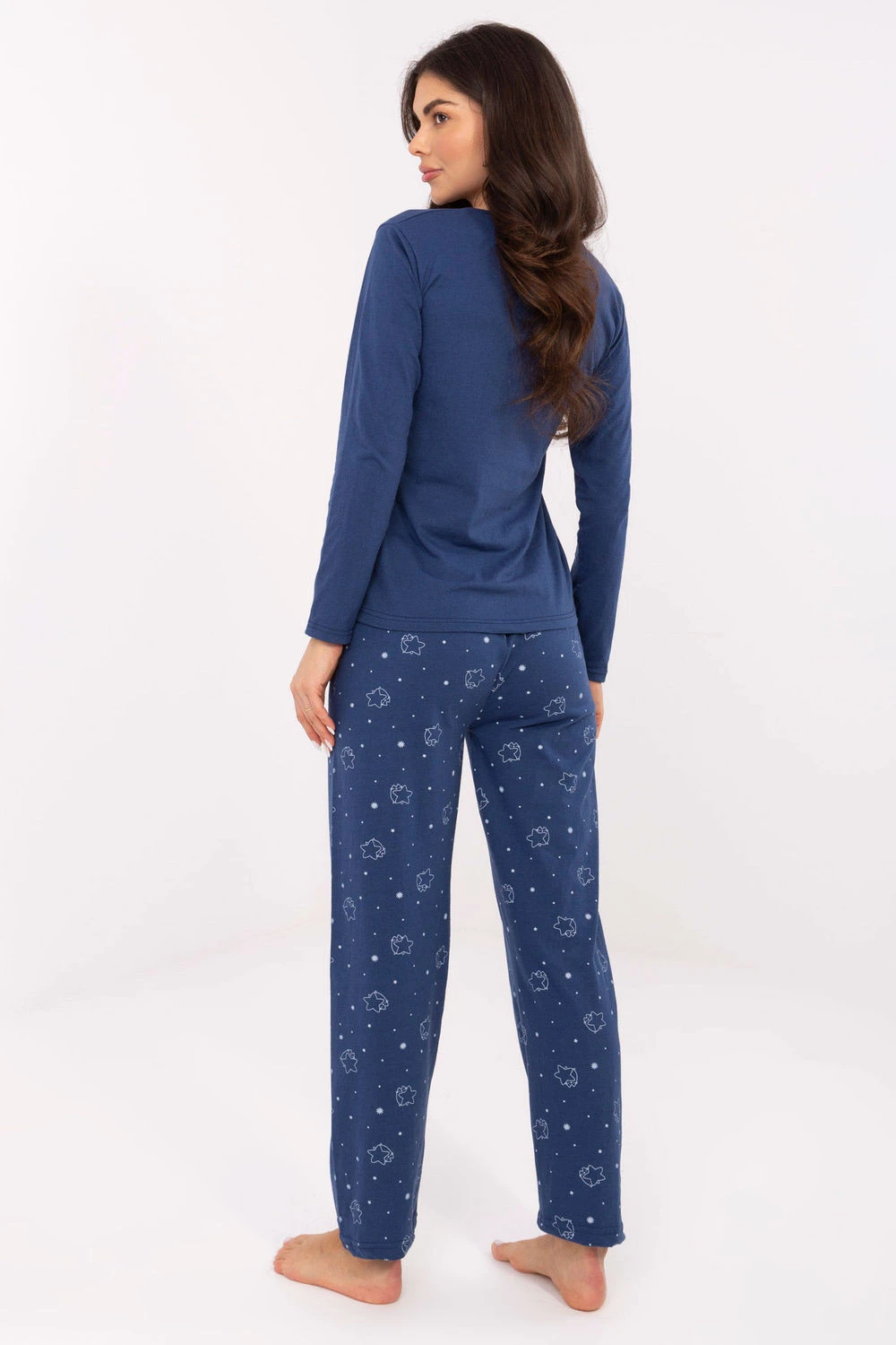 Dámský pyžamový set skládající se z trička a dlouhých kalhot, vyrobený z měkkých a pohodlných materiálů ideálních pro noční odpočinek. Tričko je zdobené hvězdičkovým potiskem, který dodává celku lehký a příjemný charakter. Má kulatý výstřih a dlouhý rukáv, poskytující pohodlí a teplo. Dlouhé kalhoty mají rovný střih nohavic, zaručující volnost pohybu a klasický vzhled. Jedná se o stylový a pohodlný pyžamový set navržený pro klidný a pohodlný spánek.