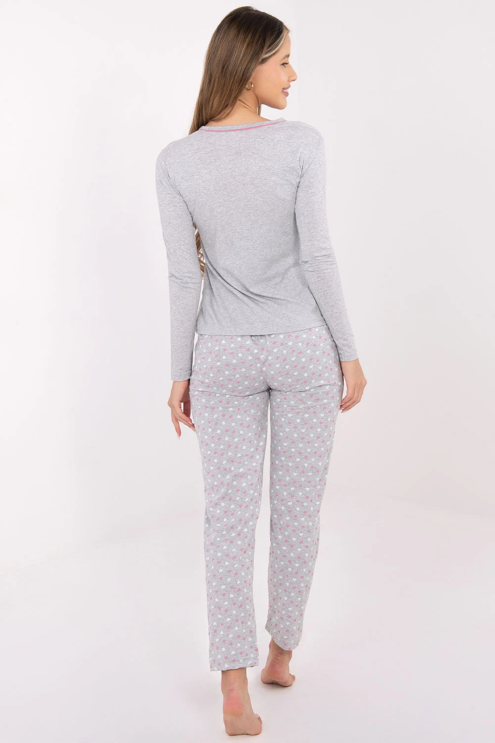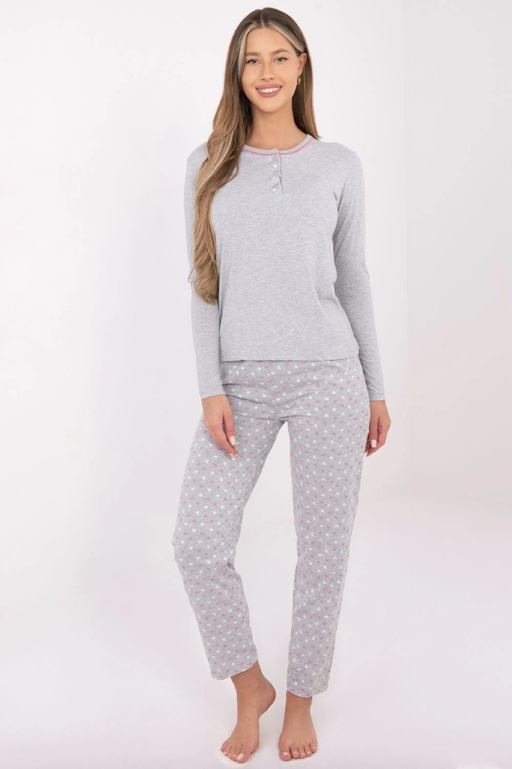 Pohodlný dvoudílný ženský pyžamo vyrobené z měkké a příjemné bavlny, ideální pro klidný spánek a domácí relaxaci. Souprava se skládá z topu s dlouhým rukávem a dlouhých kalhot s rovnými nohavicemi. Top je vybavený kulatým výstřihem a třemi dekorativními knoflíky na přední straně, které mu dodávají jemný šarm. Kalhoty zdobí dominantní potisk, který dává kompletnímu outfitu lehkost a ženský charakter. Pyžamo spojuje pohodlí, jednoduchost a jemné detaily, díky nimž se skvěle hodí na každou noc.