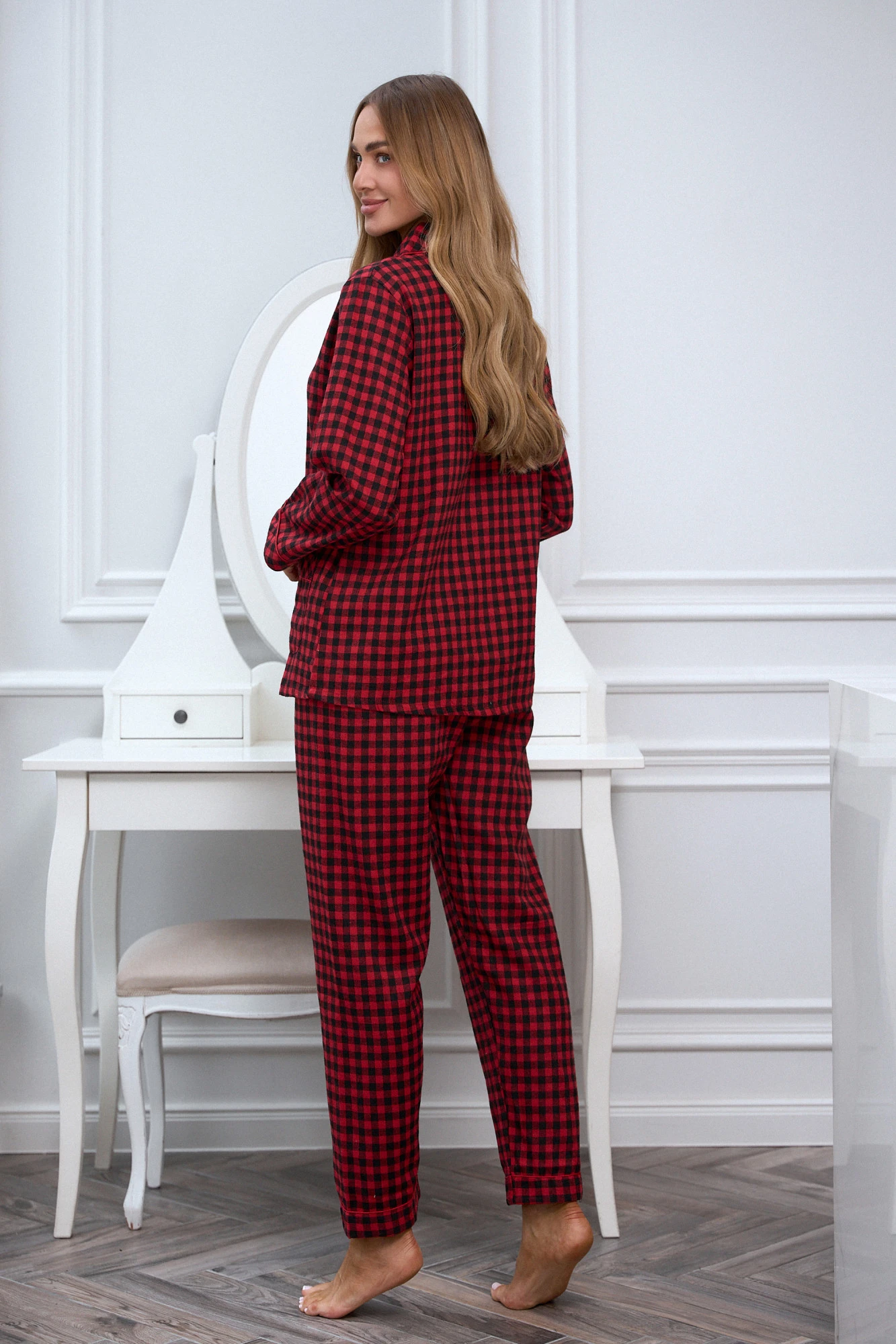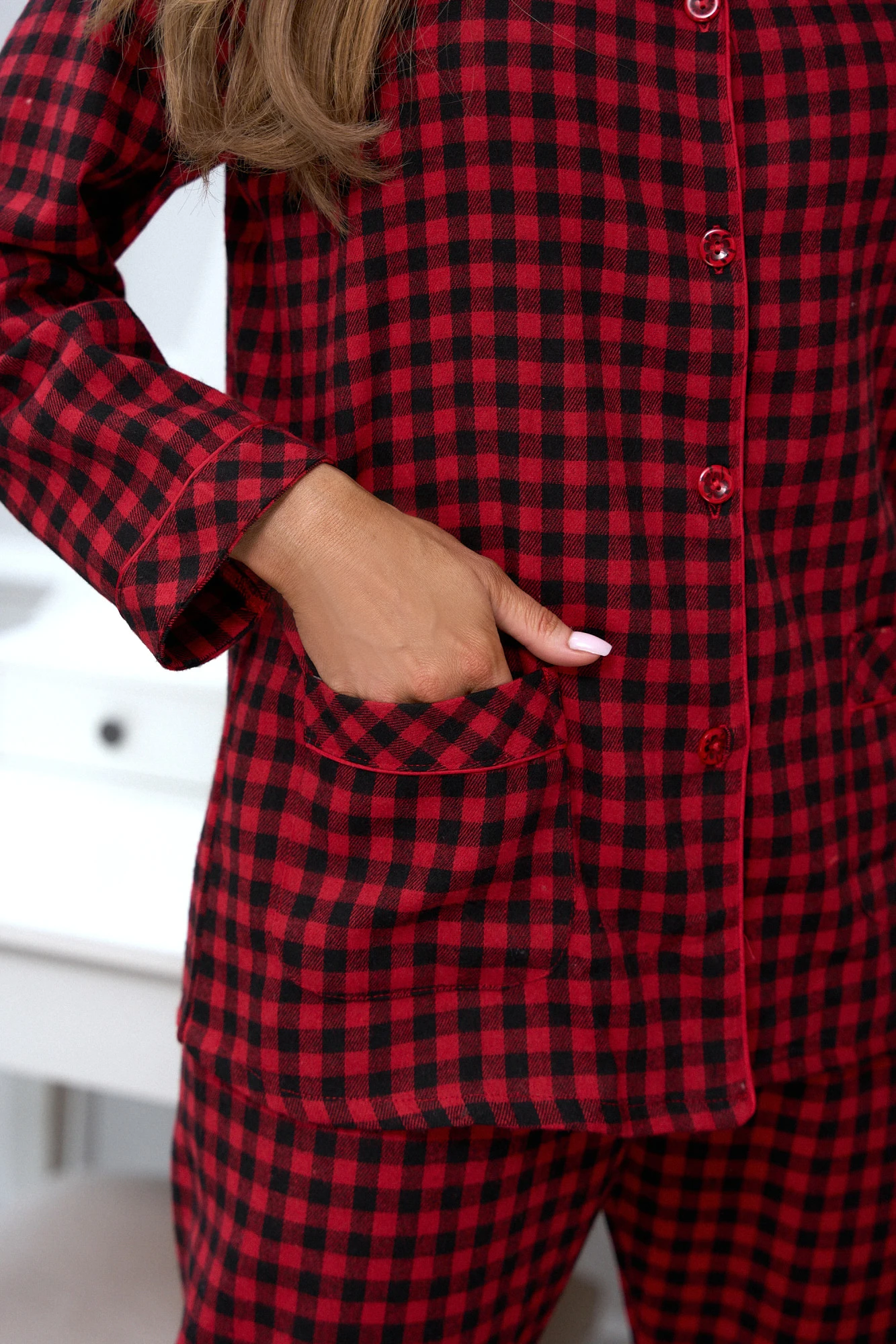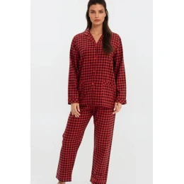 Bavlněná dámská pyžama v kostkovaném provedení X-MAS je klasický set vytvořený s ohledem na chladné večery a útulná rána. Výrazný červený kostkovaný vzor v kombinaci s měkkou, prodyšnou bavlnou dodává pyžamu nadčasový zimní charakter. Košile s knoflíky a kalhoty s rovným střihem zajistí plnou volnost pohybu a pohodlí při nošení. Pečlivě zpracované detaily, jako kontrastní lem nebo praktické kapsy, zdůrazňují jak funkčnost, tak estetiku setu. Je to pyžama, která spojuje tradiční styl s pohodlím, ideální pro klidné chvíle v domácím útulku. Klasický kostkovaný vzor v odstínech červené a černé nadčasový, vánoční charakter. Pyžama X-MAS skvěle zapadá do zimní atmosféry, ideální na lenivé ráno s šálkem horkého čaje, večerní filmové večery nebo vánoční chvíle klidu. Zajišťuje pohodlí a styl v každém domácím okamžiku. Každý model Pure Sin je vyroben z vysoce kvalitních materiálů, s důrazem na nejmenší detaily, ideální pro ženskou postavu a precizní zpracování. Je to prádlo, které okouzlí svou formou a zajišťuje pohodlí nošení, protože smyslnost si zaslouží dokonalé provedení.