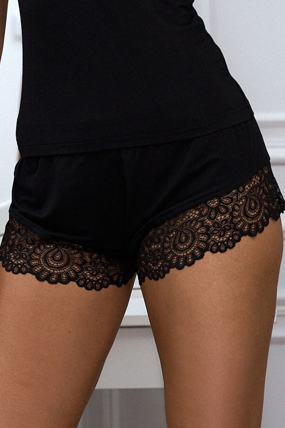 Černá dámská dvoudílná pyžama SOFT SKIMS je spojením ženské elegance a výjimečného pohodlí. Klasické černé barvy dodávají setu nadčasový charakter, zatímco jemná krajková ozdoba decentně zdůrazňuje výstřih a linii nohou, přidávajíc celku smyslný půvab. Měkký, elastický materiál obepíná pleť, poskytujíc pohodlí jak během spánku, tak večerního relaxu. Top s širokými ramínky a efektním krajkovým výstřihem krásně zdůrazňuje siluetu, podtrhujíc ženské tvary. Krátké šortky ozdobené decentní krajkou se skvěle přizpůsobují tělu, zaručují volnost pohybu a lehkost. Tento set je určen pro ženy, které oceňují styl, pohodlí a decentní smyslnost i v domácím prostředí. Pyžamo SOFT SKIMS je ideální volbou pro ženy, které milují minimalismus spojený s pohodlím a decentní smyslností. Skvěle poslouží během klidných večerů, lenivých ráno a chvil relaxace, umožňujíc cítit se krásně a sebejistě každý den. Každý model Pure Sin je vyroben z kvalitních materiálů, s důrazem na nejmenší detaily, dokonalé padnutí ke ženské siluetě a precizní zpracování. Tento spodní prádlo okouzlí svou formou a poskytne pohodlí při nošení, protože smyslnost si zaslouží dokonalé provedení.