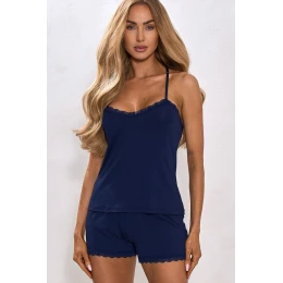 Modrá dámská pyžamo s ramínky a krátkými šortkami COMFY SIN je elegantní a neuvěřitelně pohodlný komplet navržený pro ženy, které chtějí spojit lehkost letní noční bielizny s ženským stylem. Hluboký odstín granátu dodává celku eleganci, zatímco jemná tkanina poskytuje příjemný pocit chladu a volnosti během spánku v teplejších nocích. Tričko s tenkými, nastavitelnými ramínky jemně zdůrazňuje ramena, zatímco efektní korzetový pruh na zádech představuje smyslný, přitažlivý akcent. Hladký přední díl doplněný jemnou krajkou u výstřihu udržuje rovnováhu mezi jednoduchostí a elegancí. Krátké šortky z měkkého, lehkého materiálu s krajkou na nohavičkách se krásně tvarují podle postavy a poskytují plný komfort nošení. Pyžamo COMFY SIN je harmonické spojení jednoduchosti, romantické elegance a pohodlí. Skvělé na letní večery a noci, umožňuje cítit se volně, žensky a výjimečně i v domácím prostředí. Každý model Pure Sin je vyroben z kvalitních materiálů s důrazem na nejmenší detaily, ideální pro ženskou siluetu a precizní zpracování. Je to prádlo, které okouzluje svým tvarem a zajišťuje pohodlné nošení, protože smyslnost si zaslouží dokonalé provedení.