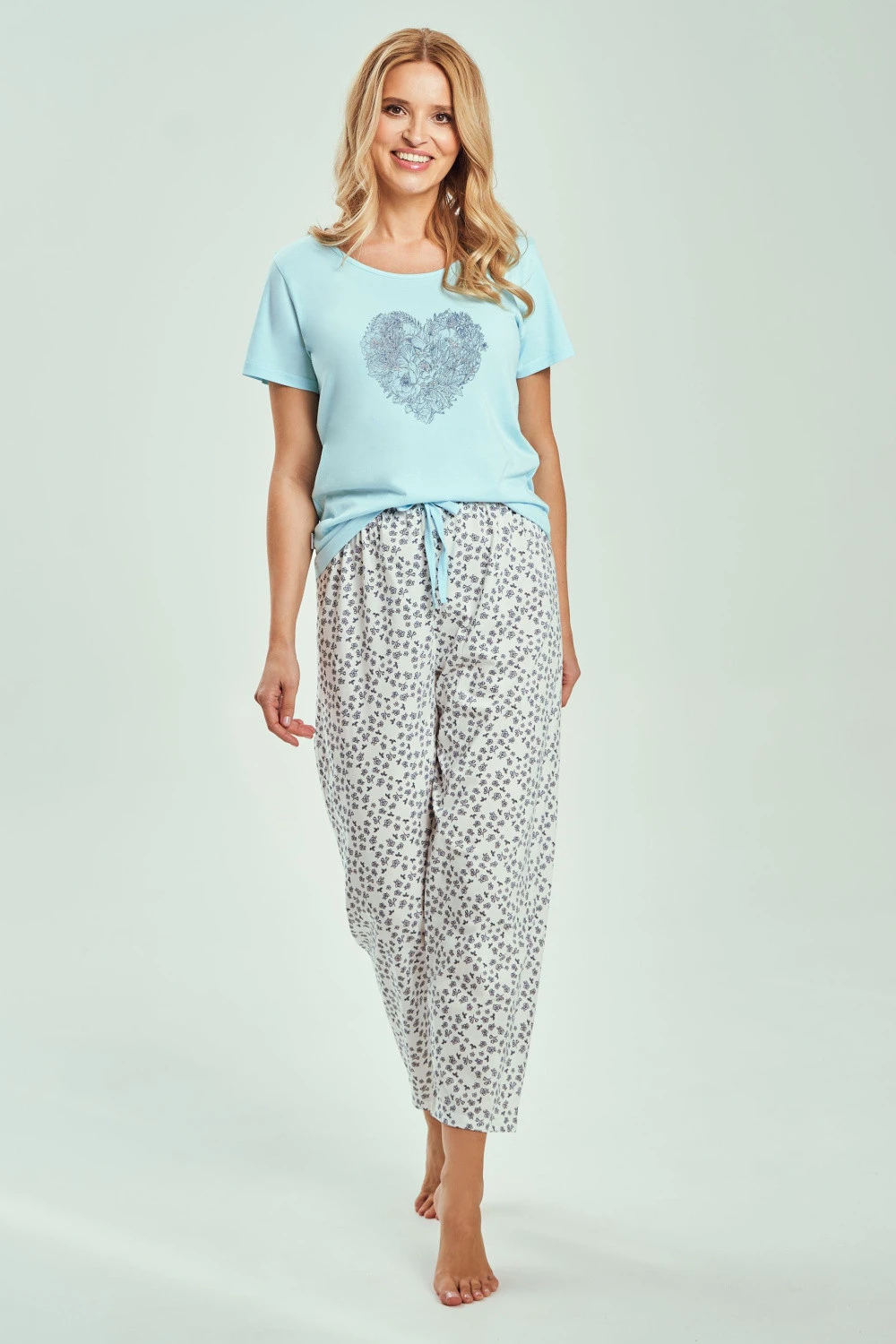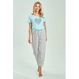 Dámský pyžamový set vyrobený z měkké a příjemné bavlny je ideální volbou pro ženy, které ocení pohodlí a decentní styl. Tričko s krátkým rukávem a polokruhovým výstřihem poskytuje pohodlí při nošení a světlá barevná kombinace je doplněna jemným srdcovým potiskem na přední straně trička, což dodává celku šarm. Vzorované kalhoty délky 7/8 se skvěle kombinují s vrchním dílem, a elastický pásek s bavlněným lemem a šňůrkou zajistí ideální přizpůsobení. Pyžamo je zabalené v praktickém fóliovém sáčku a skvěle poslouží jak při spaní, tak při domácím odpočinku.
