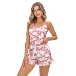 Dámský pyžamový set vyrobený v Polsku z lehké a příjemné viskózy, která poskytuje pohodlí a prodyšnost po celou noc. Souprava se skládá z topu s tenkými ramínky a krátkých kalhotek zakončených jemnou volánkou. Ozdobná mašle v pase dodává celku jemné ženské kouzlo. Celý pyžamový set je zdoben romantickým květinovým vzorem, ideální pro teplé noci a klidný odpočinek.