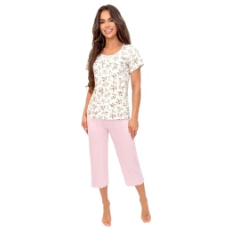 Dámský pyžamový komplet vyrobený v Polsku, vyrobený z vysoké kvality bavlny, která poskytuje pohodlí a prodyšnost během spánku. Sada se skládá z košile s krátkým rukávem, zdobené jemným květinovým vzorem, který dává celku jemný ženský charakter. Hladké kalhoty v barvě pudrově růžové dokonale doplňují sestavu, vytvářejíce souvislý a elegantní celek. Nohavice s délkou 3/4 v klasickém střihu zaručují pohodlí a volnost pohybů, ideální pro spánek a domácí relaxaci.