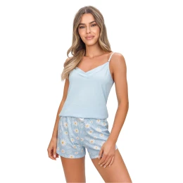 Elegantní a pohodlné dámské pyžamo, ideální na teplé noci. Košile s tenkými ramínky a elegantním výstřihem ve tvaru V decentně zdůrazňuje ženskou siluetu a zajišťuje pohodlí nošení. K celku patří krátké šortky s módním potiskem, které dodávají celku šarm a svěžest. Model má elastický pásek, který zaručuje pohodlí a ideální přizpůsobení, a ozdobná mašlička představuje ženský dekorativní prvek. Šortky nemají kapsy, co zdůrazňuje jejich minimalistický charakter. Pyžamo je baleno v praktickém fóliovém sáčku.