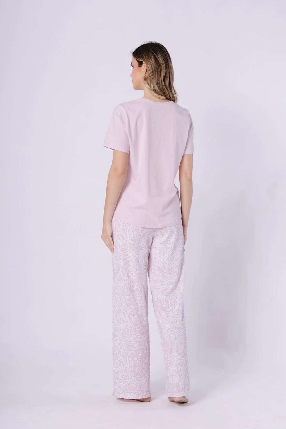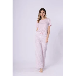 Tato elegantní dámská pyžama byla navržena s ohledem na pohodlí a volnost pohybu. Tričko s krátkým rukávem a polokroužkovým výstřihem má volný a pohodlný střih, který zajišťuje úplný relax během spánku. Kalhoty ve střihu regular fit jsou k dispozici v dlouhé verzi a jsou zdobeny decentním potiskem. Elastický pásek s dekorativní mašlí zaručuje ideální přizpůsobení. Celý komplet je balen v praktickém fóliovém sáčku, což z něj dělá skvělý nápad na dárek.