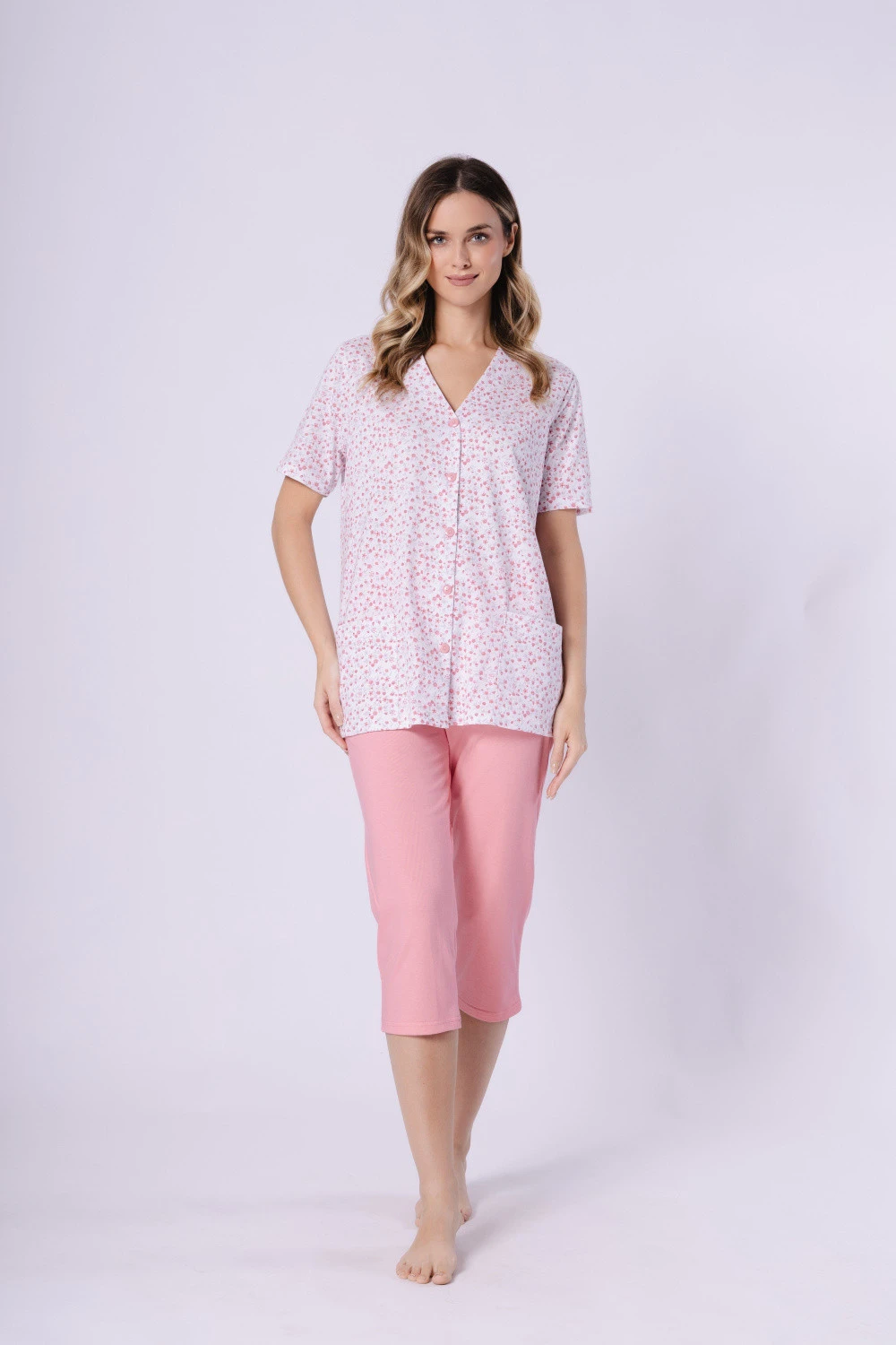 Tato stylová dámská pyžama spojuje pohodlí s funkčností. Tričko s krátkým rukávem a volným střihem je zdobeno módním potiskem a praktické kapsy po stranách přidávají každodenní pohodlí. Kalhoty typu 3/4 s elastickým pásem zajišťují volnost pohybu. Navíc košile s knoflíky umožňuje rychlé a snadné přizpůsobení. Celý set je balený v plastovém sáčku, což z ní dělá ideální volbu i jako dárek.
