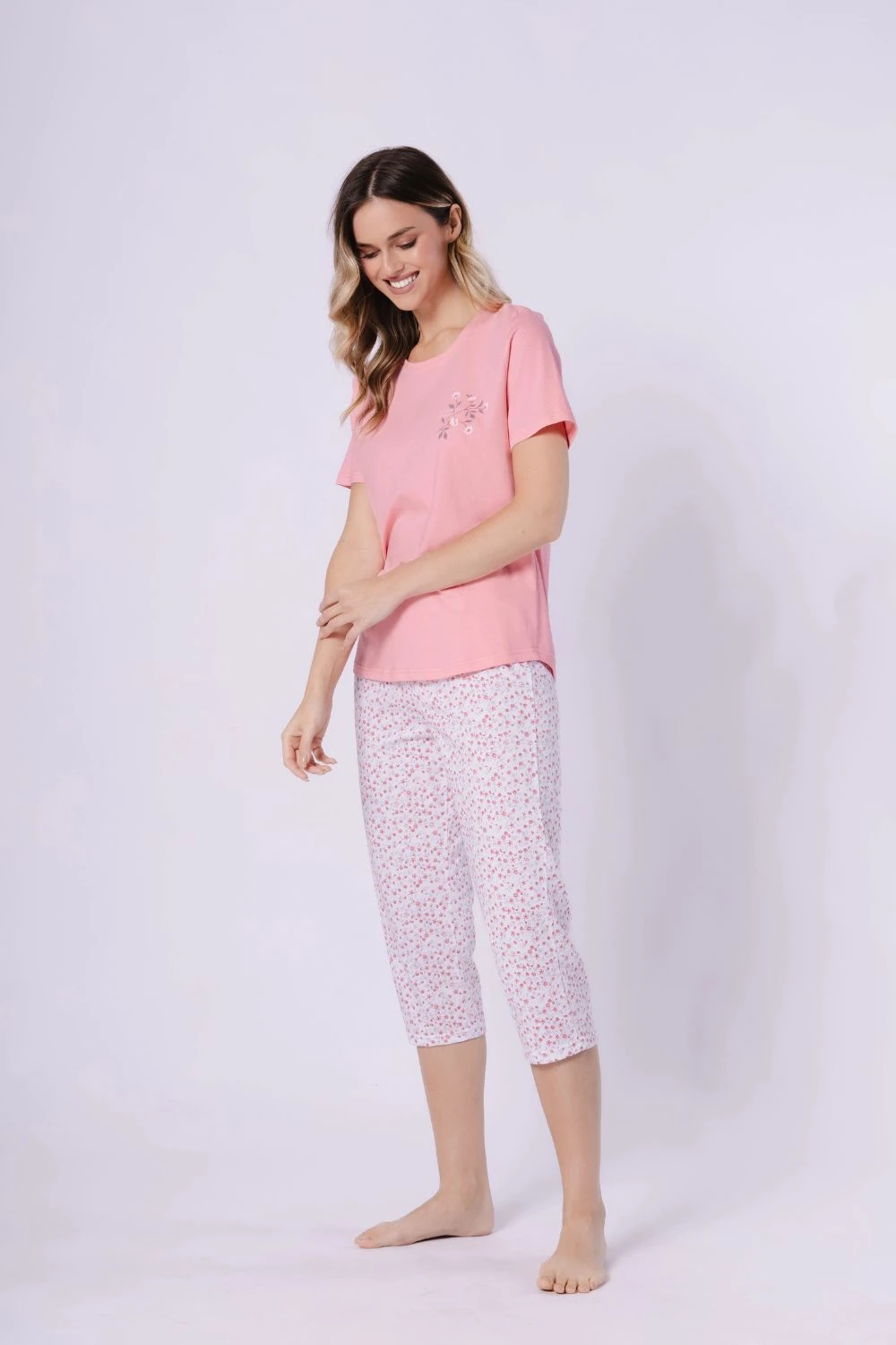 Tato roztomilá dámská pyžama spojuje pohodlí s decentním designem. Tričko s krátkým rukávem a kulatým výstřihem poskytuje volnost pohybu, zatímco kalhoty typu 3/4 zdobené decentním potiskem a s elastickou gumou v pasu zaručují perfektní sedění. Kalhoty bez kapes zdůrazňují jednoduchý, elegantní charakter pyžama. Celá souprava je balena v praktickém fóliovém sáčku, což ji činí také skvělým dárkem.