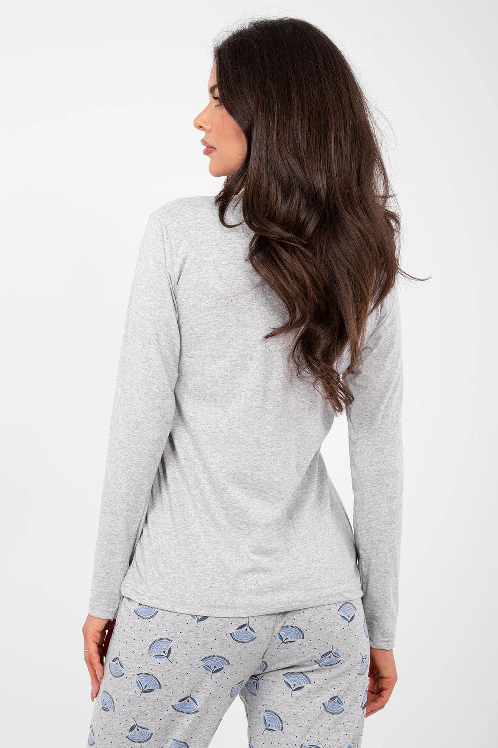 Pohodlný ženský pyžamový set skládající se z košile a kalhot navržený s ohledem na pohodlí a každodenní nošení. Vyrobený z vysoce kvalitní bavlny, která je měkká, prodyšná a šetrná k pokožce. S jemným potiskem zdobené jak kalhoty, tak přední část košile dodávají celku jednotný a ženský charakter. Košile s dlouhým rukávem a klasickým kulatým výstřihem zajistí pohodlí při nošení. Dlouhé kalhoty s přímými nohavicemi a vysokým pasem zaručují volnost pohybu a ideální přizpůsobení. Model bez kapes, s lehkou a estetickou formou.