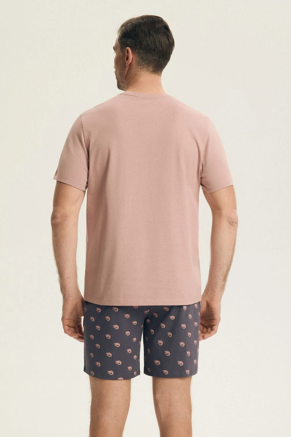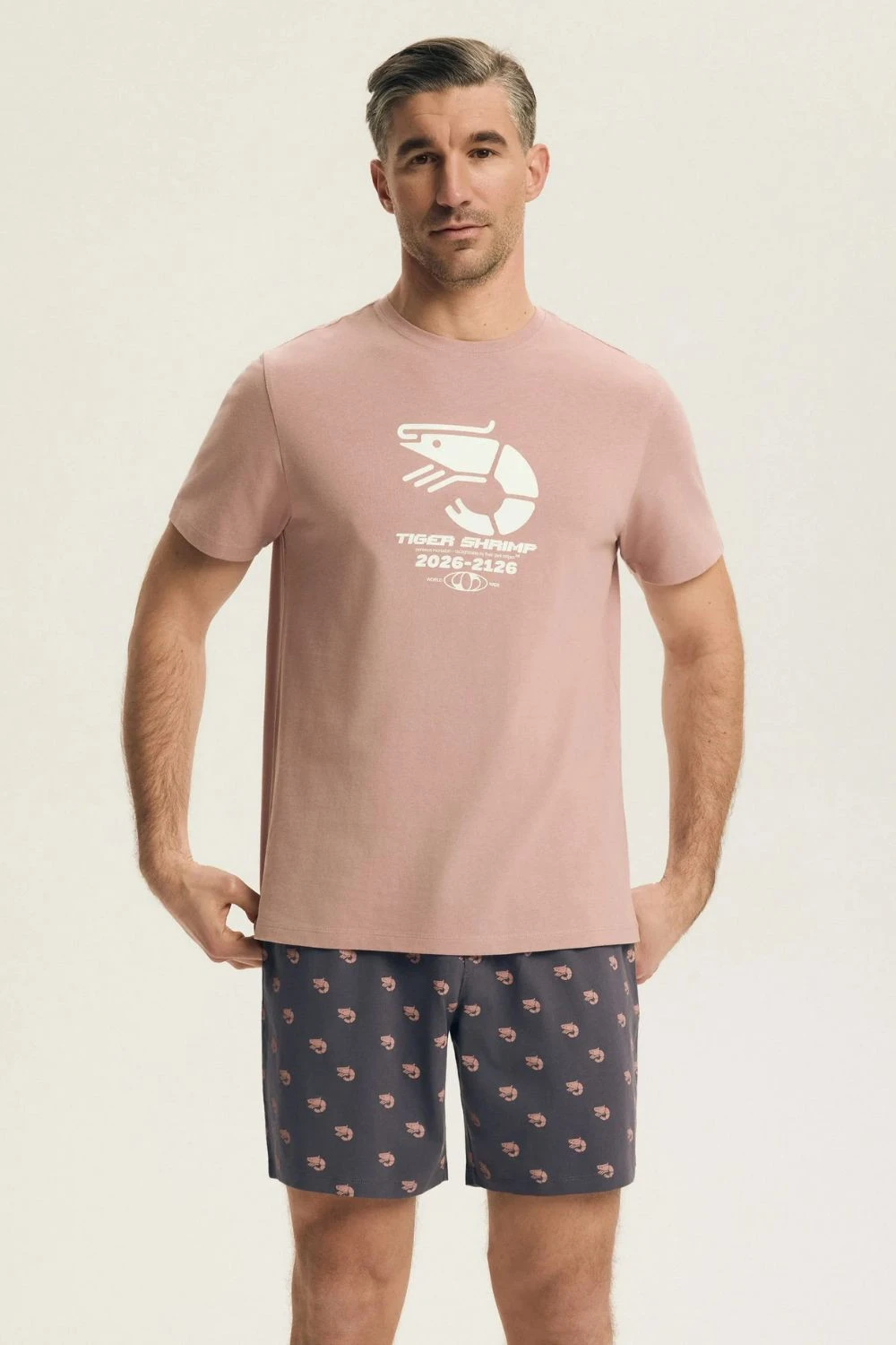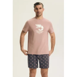 Pohodlný a stylový pánský pyžamový set je ideální volbou pro pohodlný spánek a relaxaci v domácím prostředí. Tričko s kulatým výstřihem a krátkým rukávem poskytuje volnost pohybu a klasický, nadčasový vzhled. Potisk na přední straně dodává celku charakter a moderní nádech. Souprava je vyrobena z měkké a prodyšné látky, která je příjemná k pokožce a zajišťuje správnou cirkulaci vzduchu během celé noci. Kraťasy s potiskem skvěle doplňují tričko, vytvářejíce souvislý set. Model bez kapes zaručuje lehkost a pohodlí, široký elastický pas zase zajišťuje dobré přizpůsobení a pohodlí nošení bez stlačení. Jedná se o praktickou volbu pro muže, kteří oceňují pohodlí a styl i v domácím prostředí.