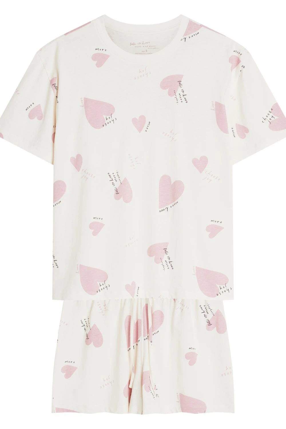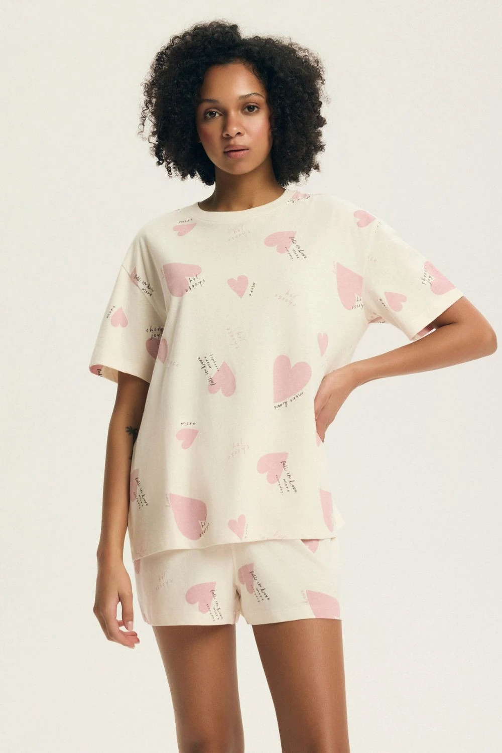 Pohodlný ženský pyžamový set je ideální kombinací pohodlí a volného stylu. Model s kulatým výstřihem a krátkým rukávem zajistí pohodlí při nošení a nadčasový vzhled. Volný, pohodlný střih zajišťuje, že souprava skvěle padne na postavu a neomezuje pohyb. Celý kus je vyroben z měkkého a prodyšného materiálu s potiskem, který je příjemný k pokožce a zajišťuje správnou cirkulaci vzduchu během spánku. Kalhoty mají elastický pásek a šňůrky v pasu, co umožňuje individuální přizpůsobení postavě. Pyžamo je dodáváno v praktickém fóliovém sáčku, díky čemuž se skvěle hodí i jako dárek.