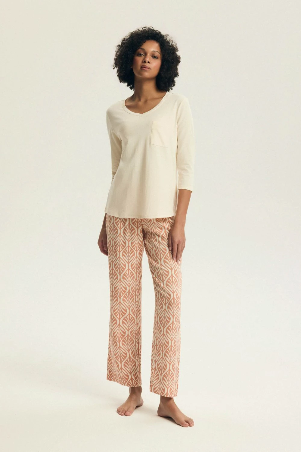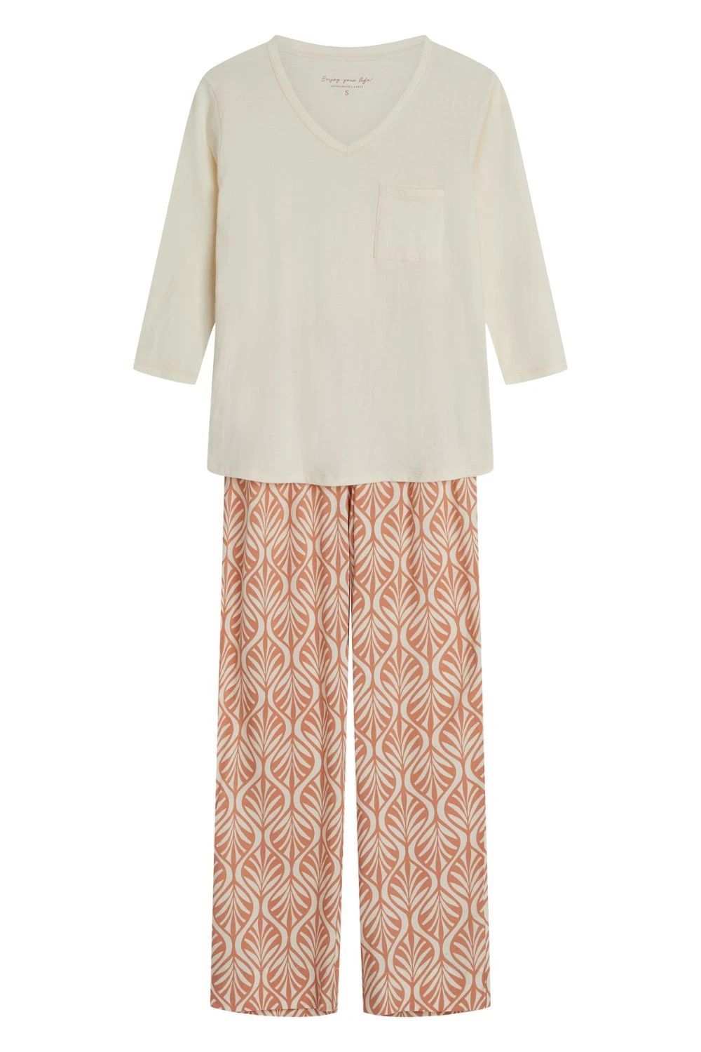 Elegantní dámský pyžamový set, který spojuje pohodlí s ženským, jemným designem. Vyrobený z měkké a prodyšné látky, poskytuje příjemný pocit lehkosti a komfortu po celou noc. Blůza s 3/4 rukávem má špičatý výstřih a praktickou kapsu na hrudi, dodávající setu jemný šarm a funkcionalitu. Jemná barevnost zdůrazňuje elegantní a decentní charakter pyžama. Dlouhé kalhoty s moderním potiskem doplňují set, a elastický pás zajišťuje pohodlné přizpůsobení a plnou volnost pohybu. Toto je ideální volba pro ženy, které ocení pohodlí, funkčnost a jemné detaily v domácí garderobě. Složení: Horní část: 100% bavlna Dolní část: 100% viskóza