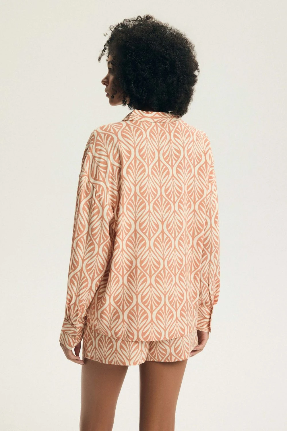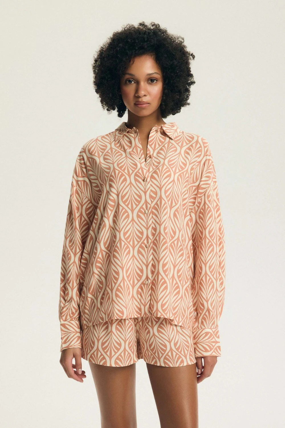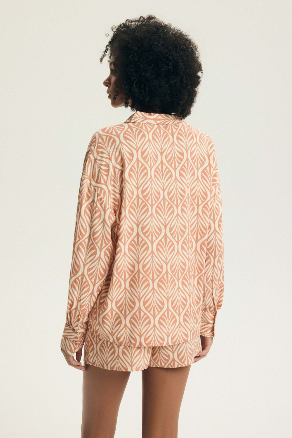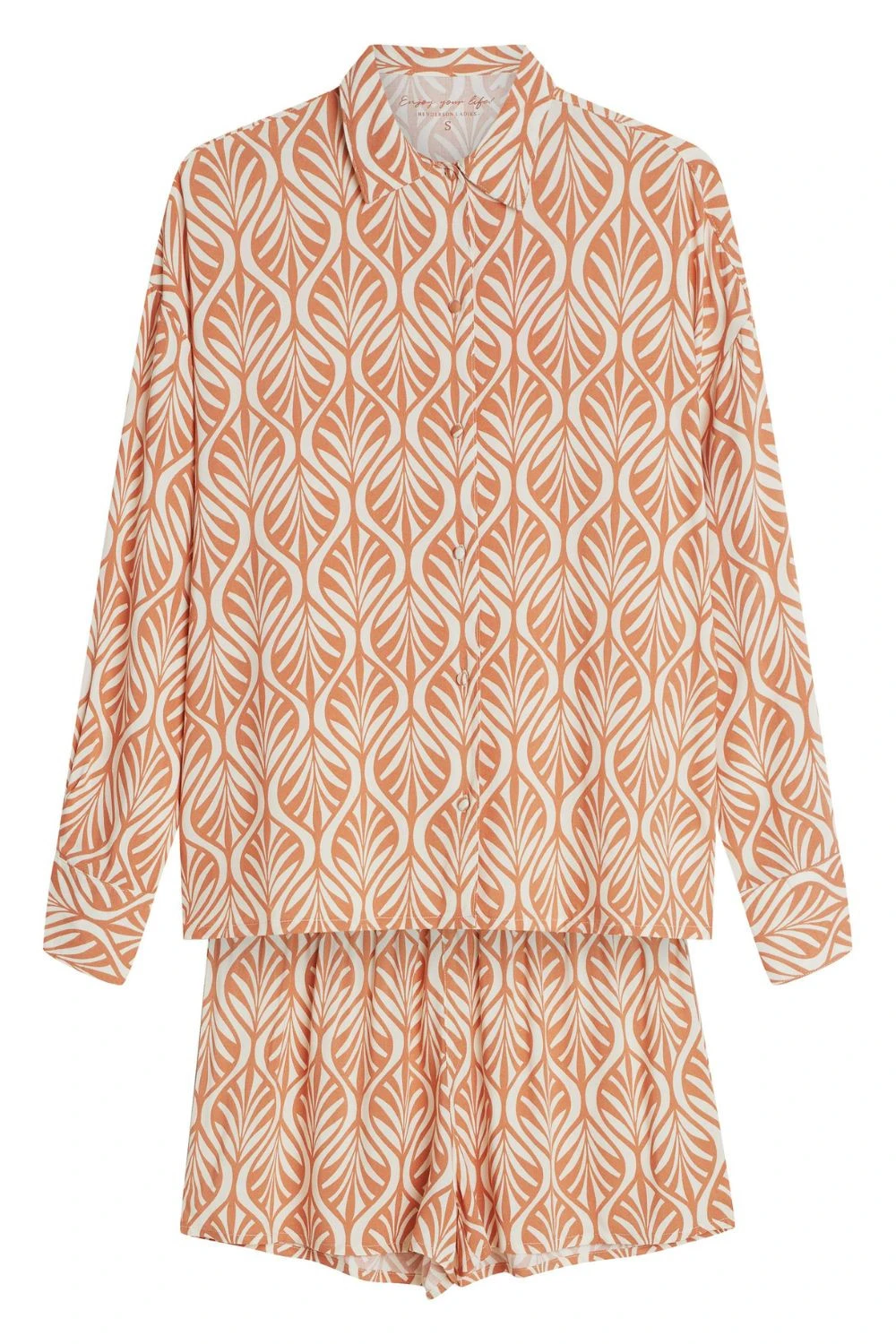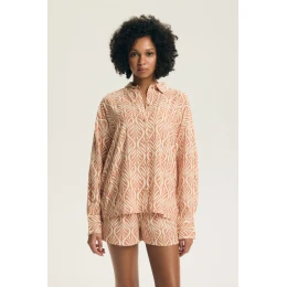 Stylový dámský pyžamový set skládající se z košile s dlouhým rukávem a krátkých kalhotek, spojující pohodlí s elegantním, klasickým stylem. Vyrobený z měkké a prodyšné látky, poskytuje pohodlí a příjemný pocit lehkosti po celou noc. Košile s límečkem a zapínáním na knoflíky dodává setu eleganci a nadčasový charakter, zatímco materiál s potiskem jemně podtrhuje moderní vzhled pyžama. Krátké kalhoty s elastickým pasem zaručují pohodlné padnutí a plnou volnost pohybů. Vysoká kvalita zpracování zajišťuje, že set je odolný a pohodlný k nošení. Dvoudílná sada, praktický a stylový návrh jak pro každodenní nošení, tak i jako dárek.
