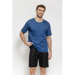 Pánský pyžamový set skládající se z trička s krátkým rukávem a krátkých kalhot je pohodlnou volbou na každou noc. Tričko s kulatým výstřihem je zdobeno malým, decentním nápisem, který dodává celku moderní a stylový charakter. Volný, pohodlný střih zajišťuje volnost pohybu a pohodlí během spánku a každodenního odpočinku doma. Krátké kalhoty s potiskem skvěle doplňují set a elastický pásek zajistí dobré přizpůsobení postavě a pohodlí nošení. Celý set je balený v plastovém sáčku, což chrání produkt a usnadňuje jeho skladování.
