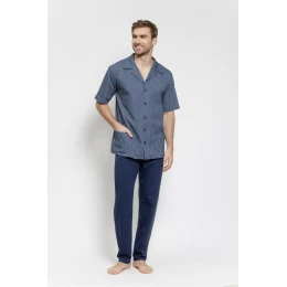 Mužský pyžamový set je pohodlný a stylový návrh, ideální jak pro spaní, tak i jako pohodlné oblečení doma. Sestava se skládá z košile s krátkým rukávem, zapínací na knoflíky a dokončenou klasickým límcem, co dává celku elegantní, nadčasový charakter. Košile je zdobená potiskem a vybavena praktickými kapsami, které zvyšují její funkčnost. Soupravu doplňují dlouhé kalhoty bez kapes, s elastickou gumou v pasu, která zajišťuje pohodlné přizpůsobení postavě a volnost pohybu. Celý set je balený v fóliovém obalu, který chrání výrobek a usnadňuje jeho skladování.