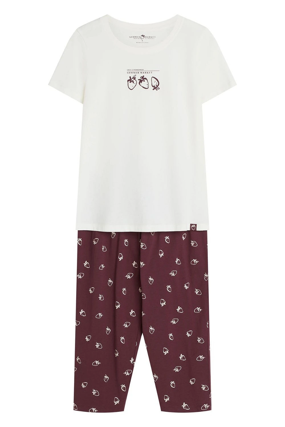 Pyžamo pro ženy vytvořené s ohledem na pohodlí a volnost během spánku a domácího relaxu. Souprava se skládá z trička s krátkým rukávem a módním potiskem, který dodává celku ženský a ležérní charakter. Vyrobeno z prodyšné látky, díky čemuž je lehké, příjemné k pokožce a poskytuje pohodlí po celou noc. K soupravě patří kalhoty typu 3/4 s přizpůsobeným potiskem, které vytvářejí souvislý a stylový vzhled. Model bez kapes má jednoduchý, pohodlný střih a elastický pásek v pase zajišťuje, že kalhoty dobře sedí a neomezují pohyb. Celý set je zabalený v praktickém fóliovém sáčku, co usnadňuje skladování a přepravu.