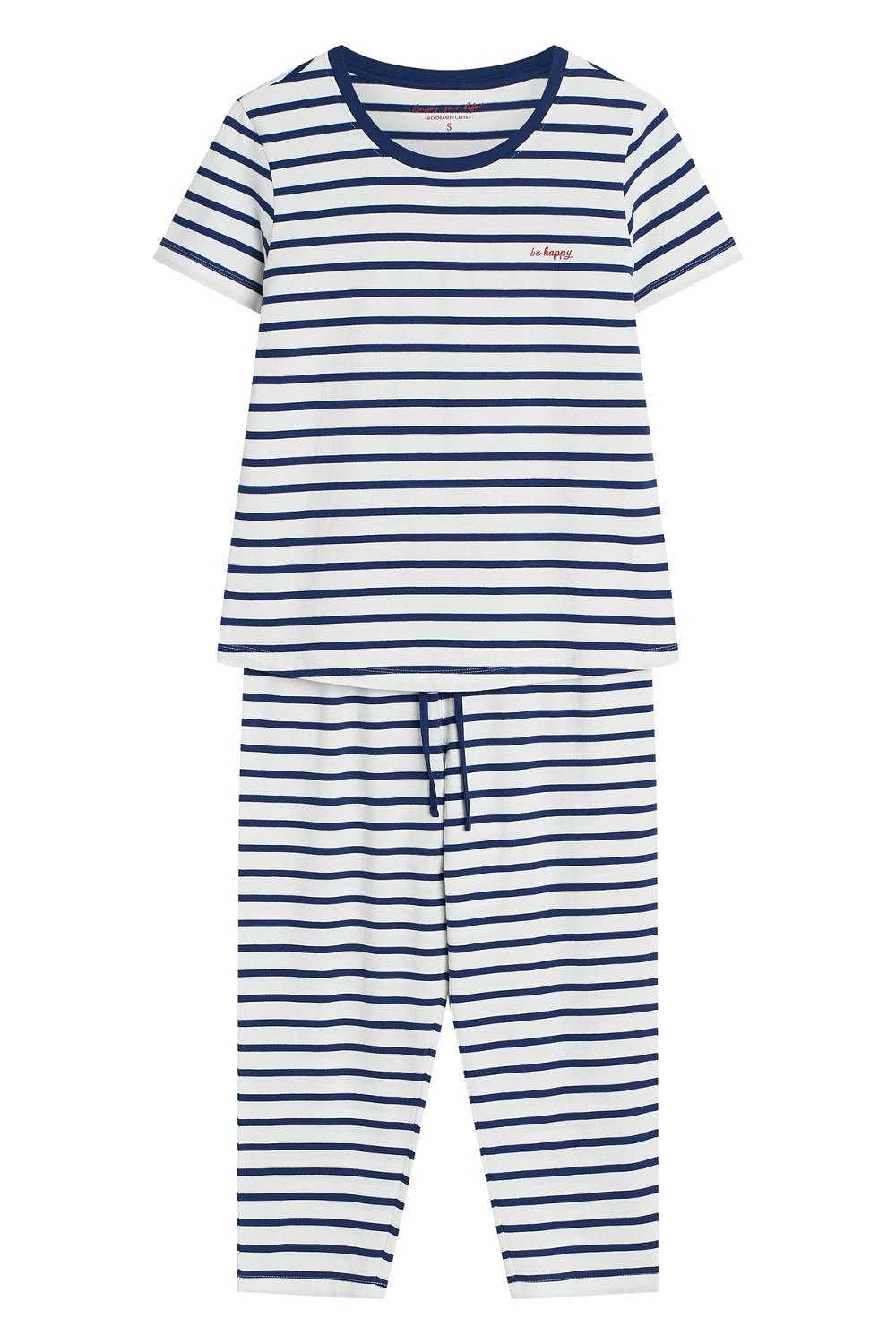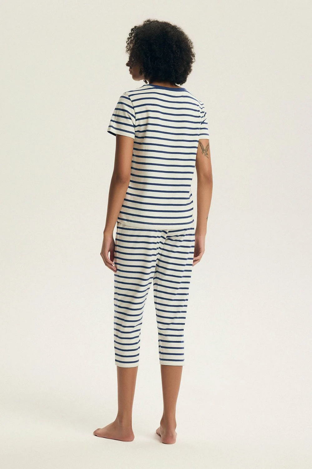 Pohodlný dámský pyžamo ideální pro klidný spánek a relaxaci v domácím útulku. Souprava se skládá z trička s krátkým rukávem a polokruhovým výstřihem, které poskytuje pohodlí a volnost pohybu. Model je zdoben moderním potiskem, který dává celku ženský a moderní charakter. Součástí jsou tříčtvrteční kalhoty s pohodlným střihem. V pasu je široká guma, která dobře sedí a dodatečné šňůrky v pase umožňují regulaci a ještě lepší přizpůsobení. Pyžamo je vyrobeno z prodyšného úpletu/tkaniny, díky čemuž je lehké, příjemné na kůži a skvěle se hodí jak na spaní, tak na domácí odpočinek.