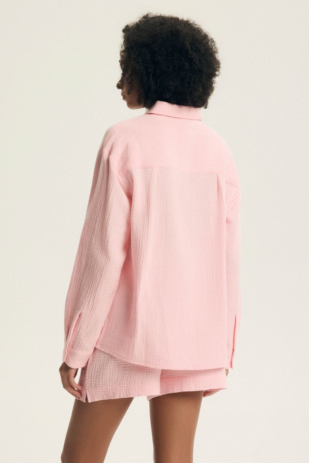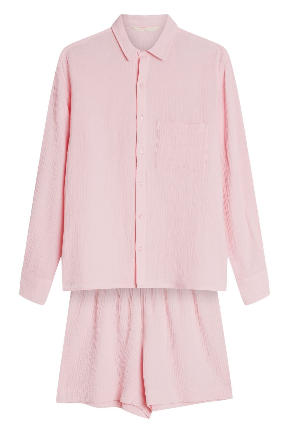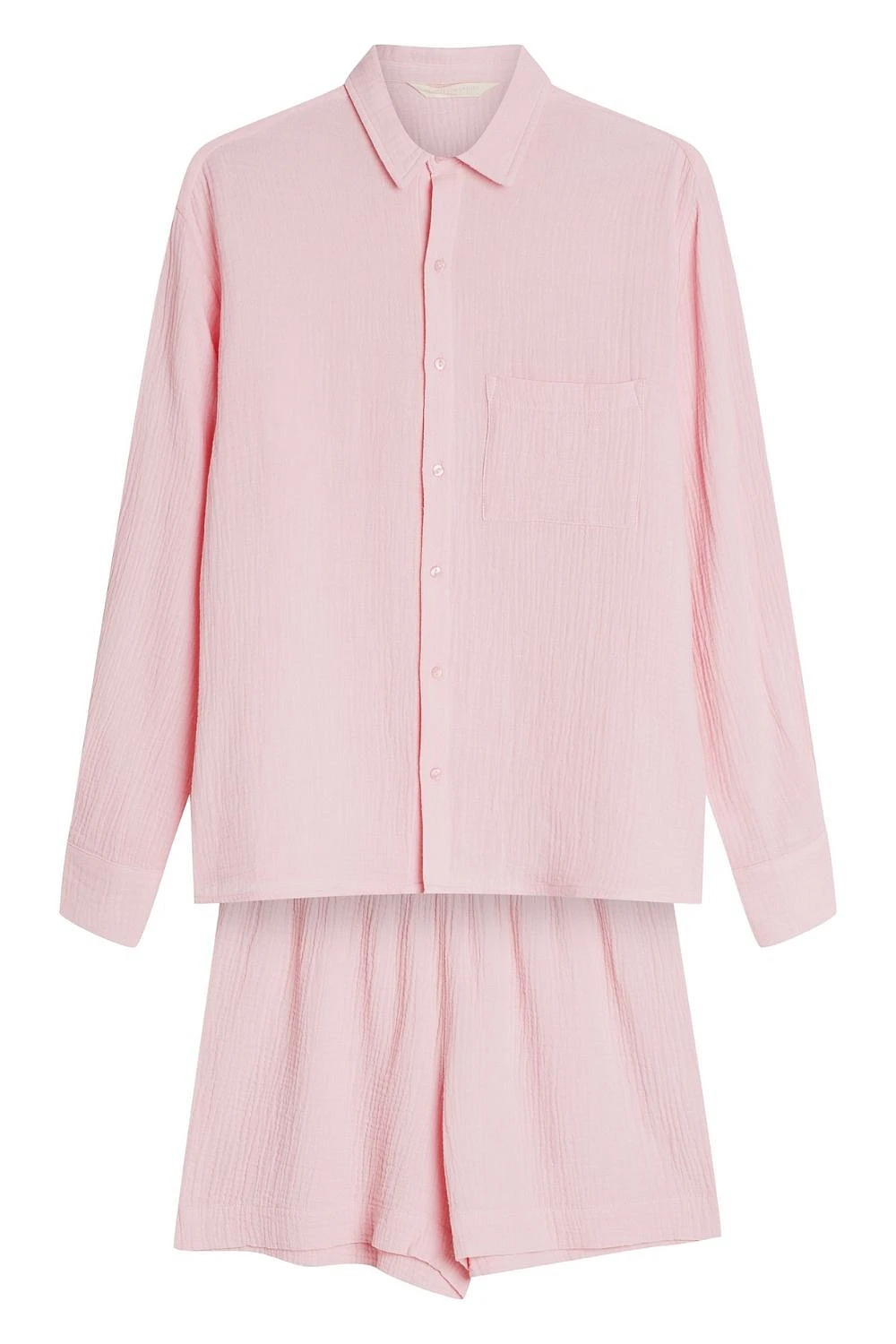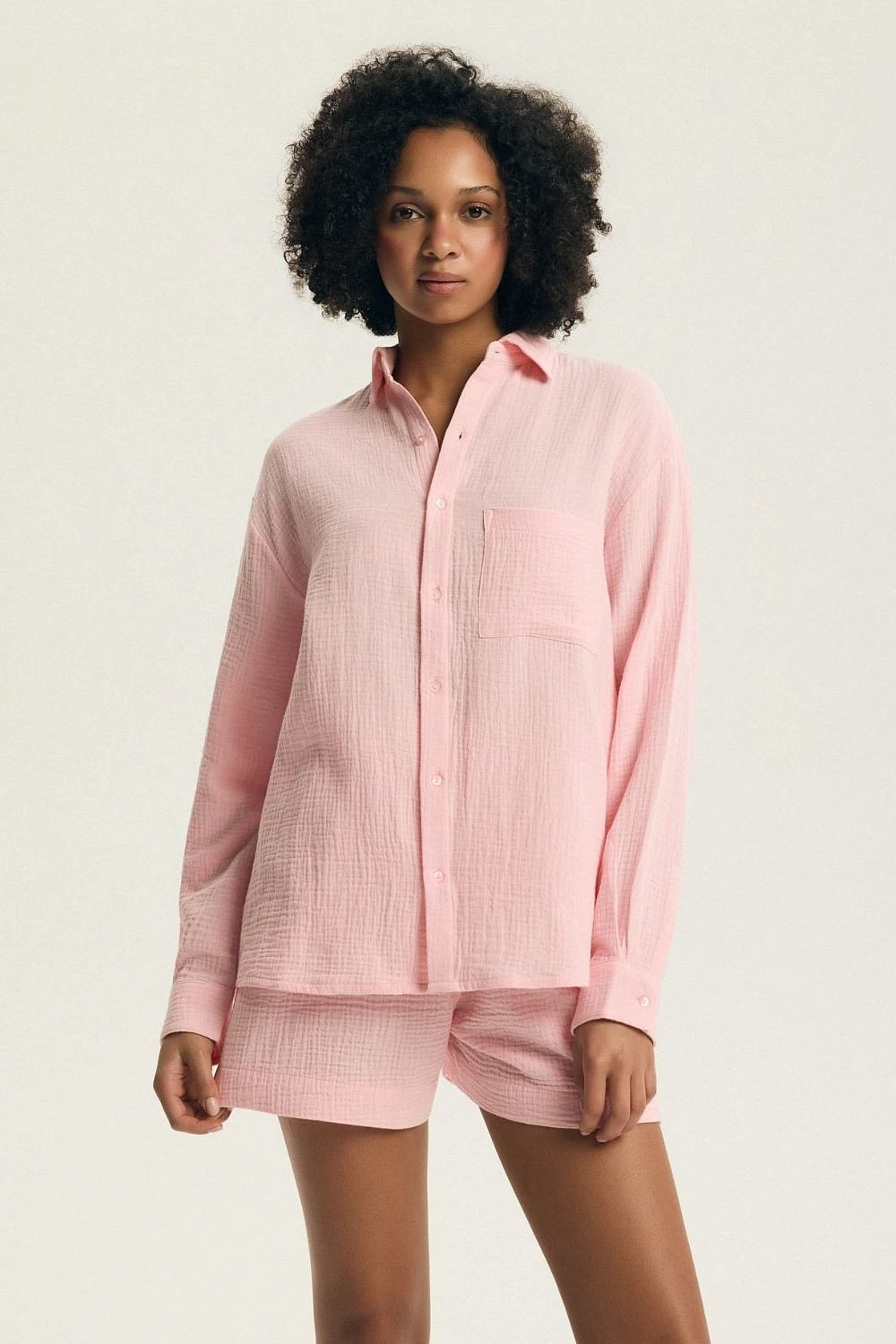 Dámská pyžama je elegantní a pohodlný set, který se skvěle hodí jak k spaní, tak jako stylový homewear. Střídmá barevnost jí dodává univerzální charakter, díky čemuž vypadá decentně a nadčasově. Košile s dlouhým rukávem je zakončena klasickým límcem a zapíná se na knoflíky, co jí dodává elegantní, košilový styl. Na hrudi je praktická kapsa, která zdůrazňuje volný charakter modelu. Volný střih zaručuje pohodlí a volnost pohybů. Set doplňují krátké kalhoty s pohodlným střihem. Díky široké gumě v pasu se dobře přizpůsobují postavě, aniž by tlačily. Celý set byl navržen s ohledem na pohodlí a styl, je ideální volbou pro ženy, které ocení pohodlí v domácím prostředí.