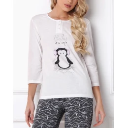Hledáte něco neobvyklého? - Vyberte si roztomilé dvoudílné dámské pyžamo s roztomilým motivem tučňáka na halence. Díky střihu halenky se budete cítit opravdu pohodlně a budete vypadat skvěle - je mírně vypasovaná, s výstřihem na knoflíky a módními, o něco kratšími rukávy. Doplňují je vzorované kalhoty s pružným pasem. Vzor s jemnými lesklými prvky. Měkká tkanina, vysoká kvalita. Složení: 60 % bavlna, 40 % polyester.