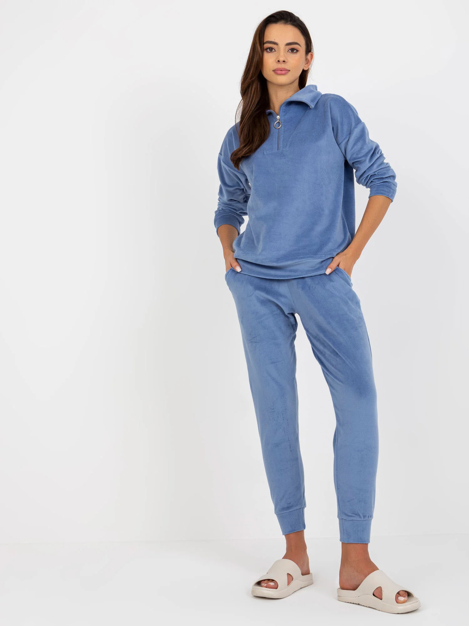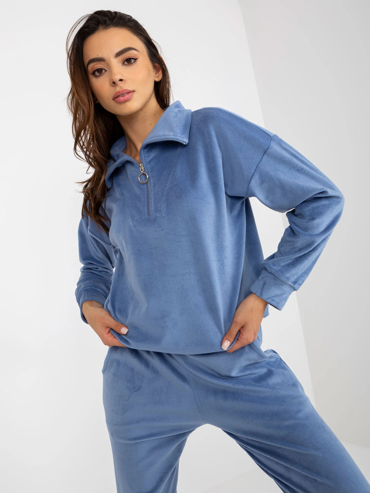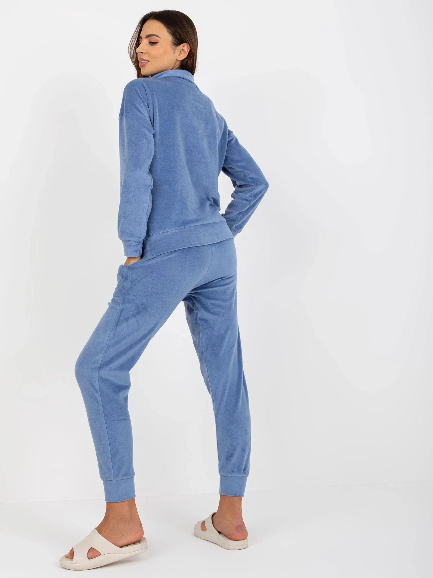 Rozměry soupravy ve velikosti S měřené na plocho: šířka halenky v podpaží - 55 cm, délka rukávů - 56 cm, délka halenky - 63 cm, šířka kalhot v pase - 33 cm, výška nohavic - 27 cm, délka nohavic - 90 cm.