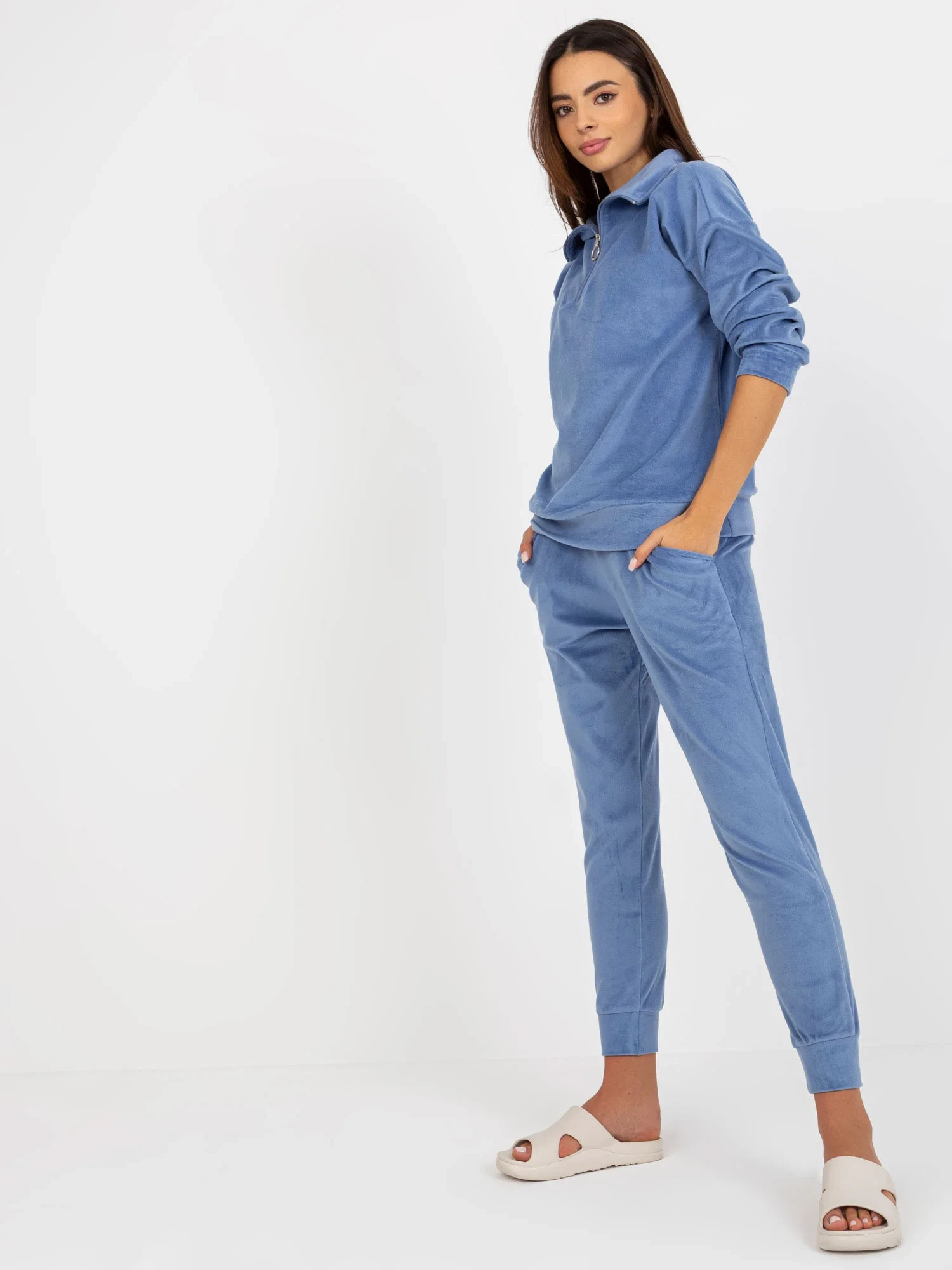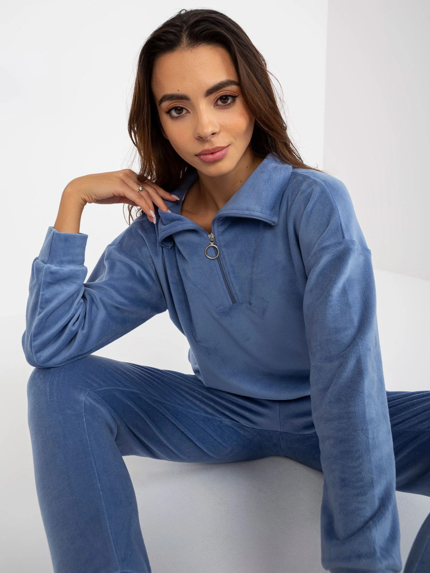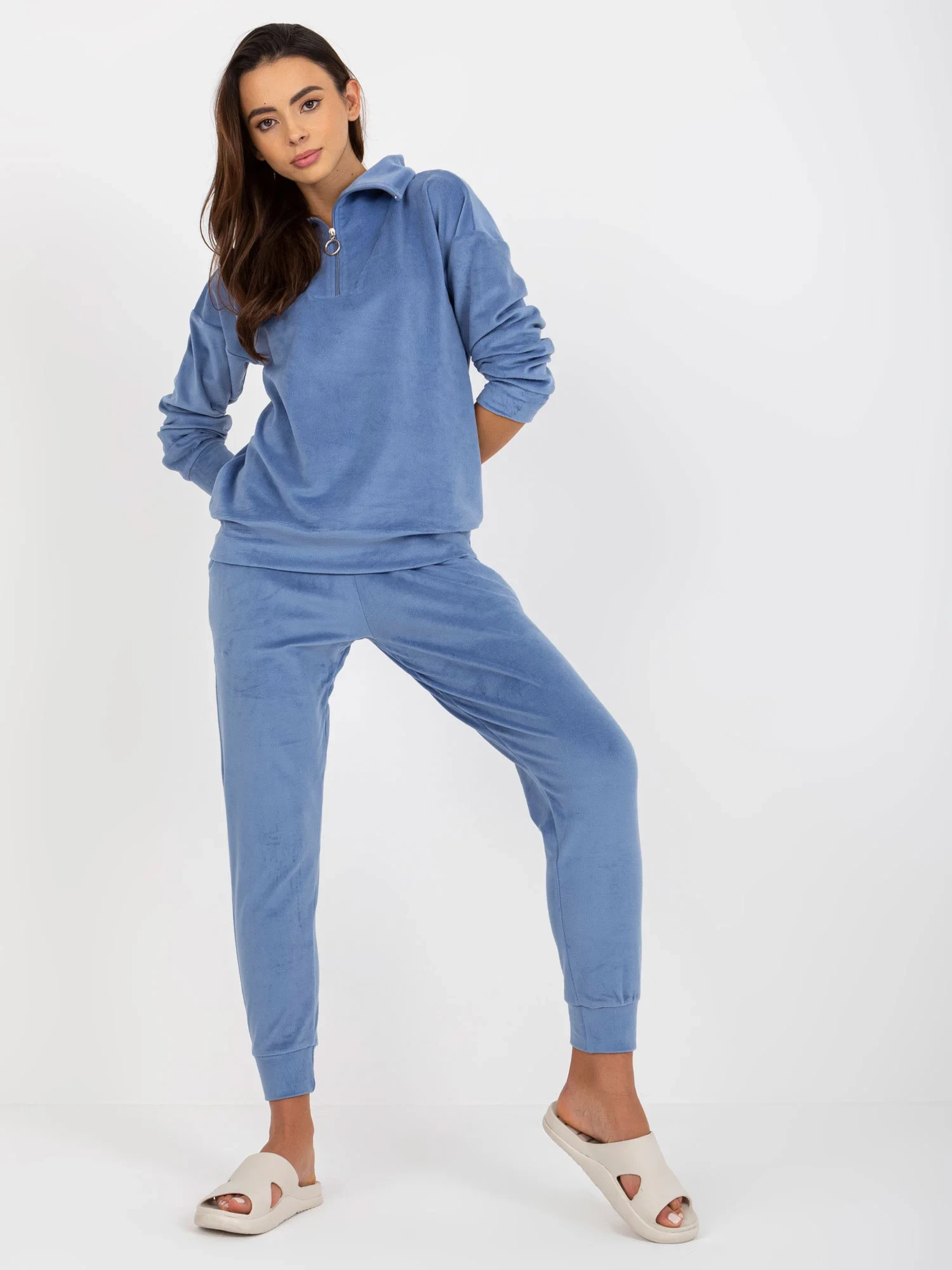 Rozměry soupravy ve velikosti S měřené na plocho: šířka halenky v podpaží - 55 cm, délka rukávů - 56 cm, délka halenky - 63 cm, šířka kalhot v pase - 33 cm, výška nohavic - 27 cm, délka nohavic - 90 cm.