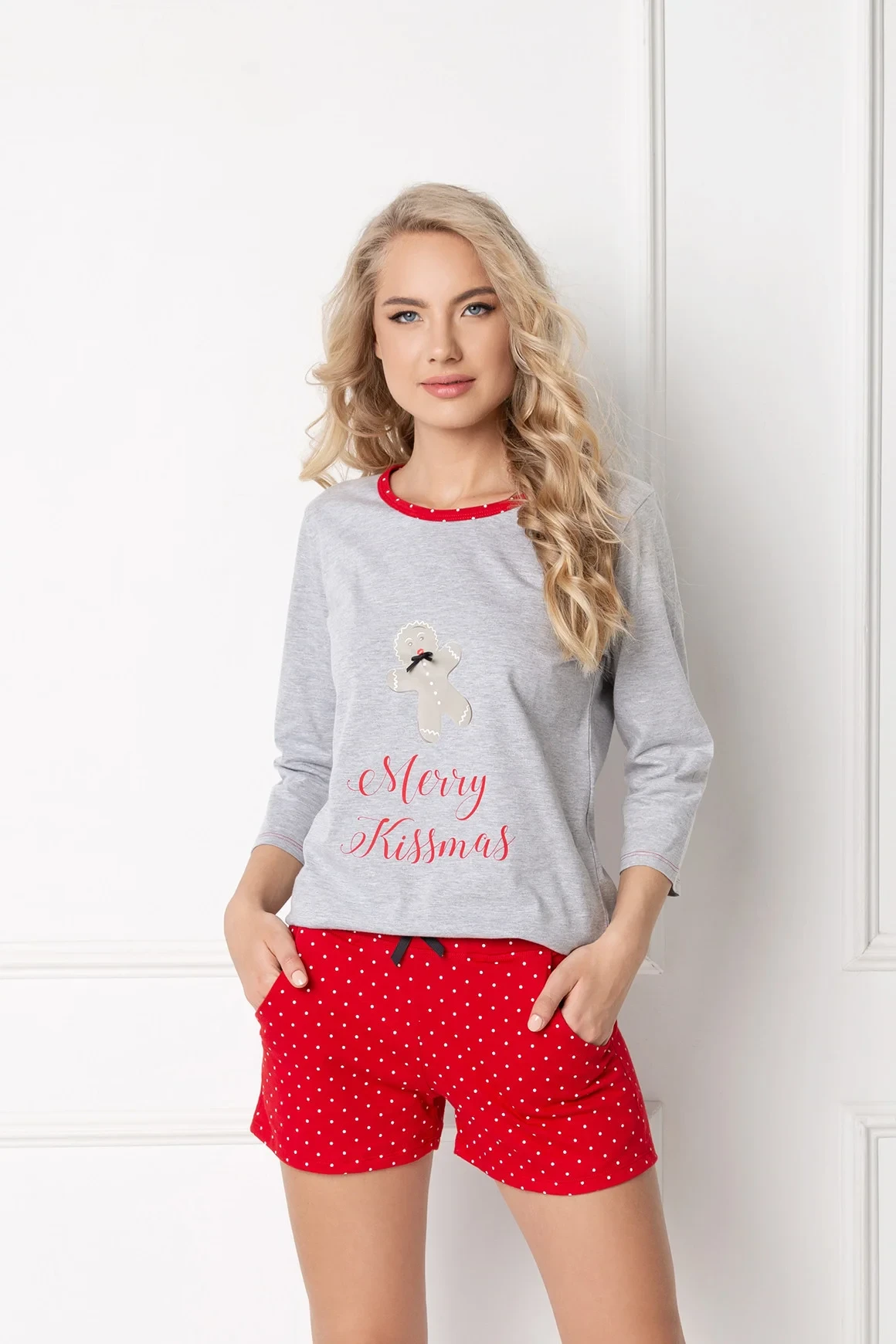 Rozkošné šedočervené pyžamo s potiskem "Merry Kissmas" a sladkým "Cake" uprostřed, z vánoční edice Aruelle. Šedá halenka s červeným lemováním u krku, módní 3/4 rukávy, červené šortky s malými bílými puntíky, mašlička v pase a dvě boční kapsy. 92 % bavlna, 8 % polyester.