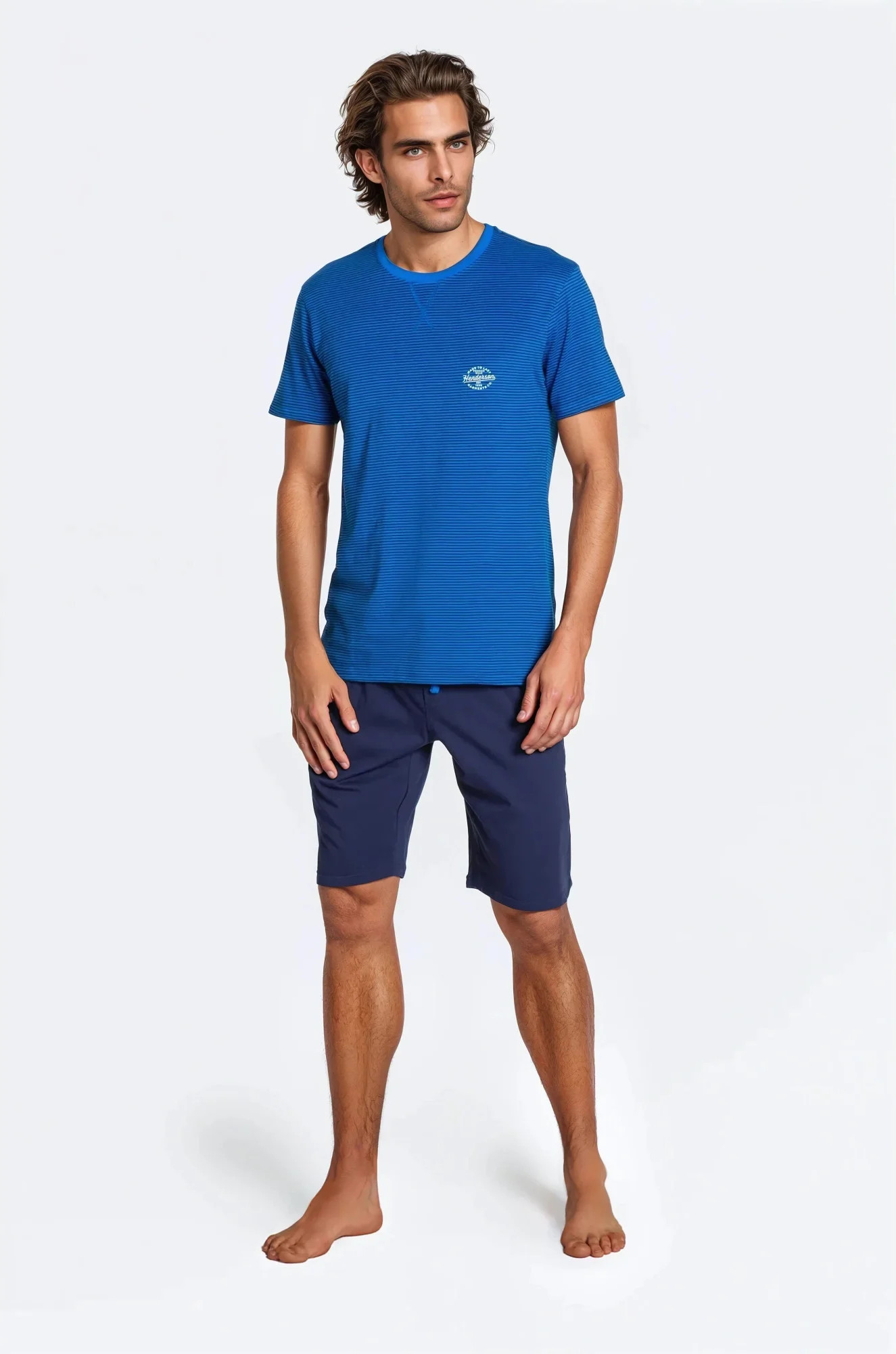 Kombinace barev s modrými tóny je univerzální volbou, ve které se bude každý muž cítit pohodlně. Drake - nejnovější pánské pyžamo Henderson - si zakládá na pohodlí a osvědčených barvách. Top v příjemném modrém odstínu, pruhovaný, s krátkými rukávy. Šortky po kolena. 100% bavlna.