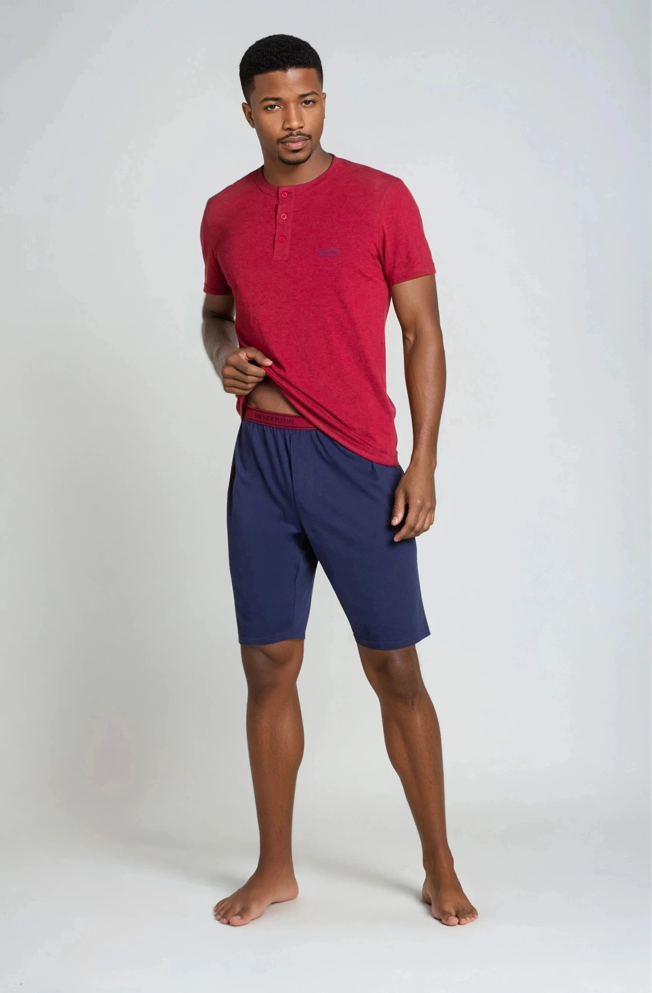 Červeno-modré pánské pyžamo s mírně vypasovanou košilí na knoflíky a velmi módními kalhotami v délce ke kolenům. Hladké kalhoty s viditelným potiskem v pase na gumu. Pokud si potrpíte také na zajímavý, módní vzhled a zároveň vám záleží na potřebném pohodlí - je to pro vás ideální volba. Složení: vrchní díl 80 % bavlna, 20 % polyester, spodní díl 100 % bavlna.