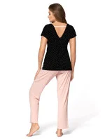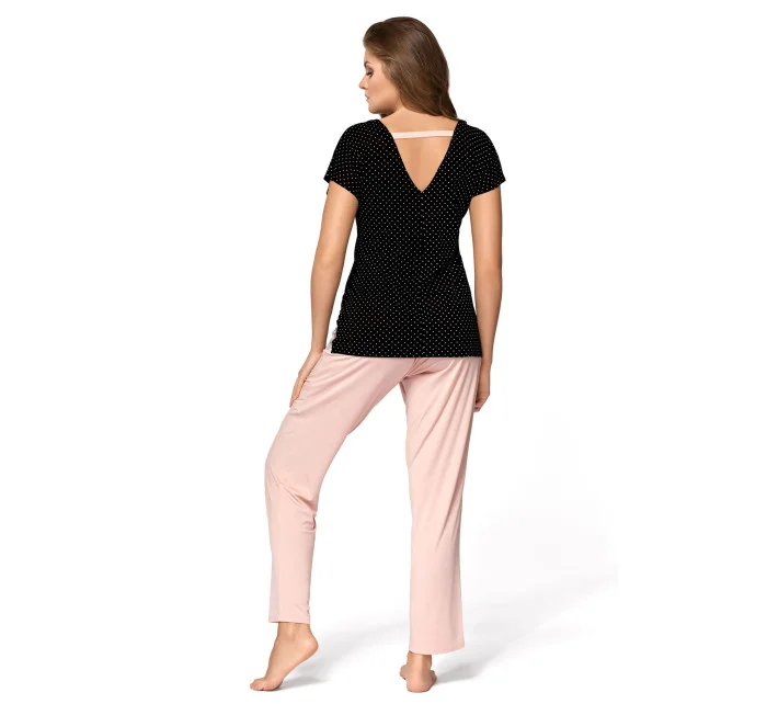 Krásné, ženské dvoudílné pyžamo Iris s puntíkovanou halenkou a hladkými kalhotami. Top s krátkými rukávy, véčkovým výstřihem vpředu i vzadu a mašlí. Kalhoty v růžové barvě (krásný odstín pudrově růžové). Fenomenální nabídka prakticky pro každou ženu. Složení: 94 % viskóza, 6 % elastan.