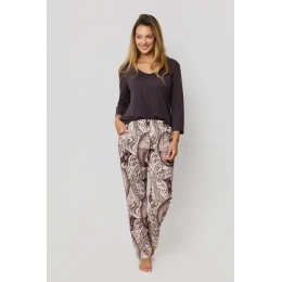 Odkryj wyjątkową piżamę damską stworzoną z myślą o najwyższym komforcie i elegancji. Miękka, gładka koszulka z wiskozy o kroju z rękawem 3/4 delikatnie otula ciało, zapewniając swobodę ruchów i przyjemne uczucie lekkości. Dekolt w szpic subtelnie podkreśla linię szyi, dodając całości kobiecego charakteru. Do kompletu dołączone są długie, bawełniane spodnie z praktycznymi kieszeniami, ozdobione efektownym orientalnym printem, który nadaje piżamie wyjątkowego stylu. To idealny zestaw dla kobiet ceniących połączenie komfortu, jakości i modnego designu. Całość zapakowana w foliowy worek – idealna także na prezent.