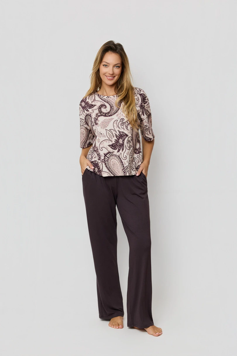 Wygodna i stylowa piżama damska wykonana z wysokiej jakości dzianin to idealny wybór dla kobiet ceniących komfort i modny wygląd. Lekka, przewiewna koszulka z krótkim rękawem została ozdobiona orientalnym printem, który nadaje całości wyjątkowego charakteru. Półokrągły dekolt podkreśla kobiecą linię szyi, zapewniając jednocześnie swobodę i pełen komfort noszenia. Do zestawu dołączone są długie spodnie z praktycznymi kieszeniami, wykonane z miękkiej, elastycznej wiskozy, dopasowującej się do sylwetki i gwarantującej wygodę przez całą noc. Komplet świetnie sprawdzi się zarówno latem, jak i w chłodniejsze wieczory. Piżama pakowana jest w foliowy worek – idealna również na prezent.