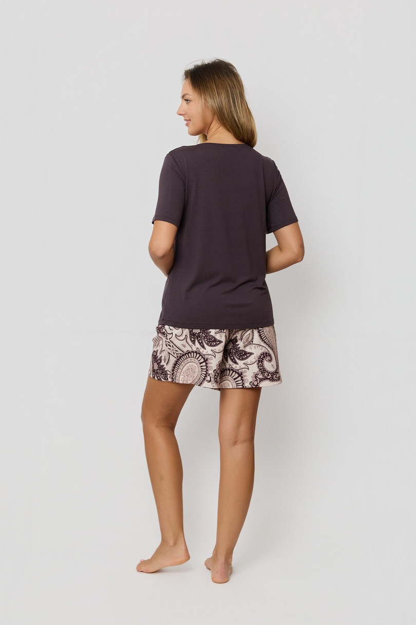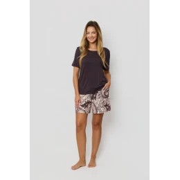 Poznaj lekką i wygodną piżamę damską stworzoną z myślą o letnich nocach oraz maksymalnym komforcie. Miękka koszulka z wiskozy o krótkim rękawie i półokrągłym dekolcie doskonale układa się na sylwetce, zapewniając przewiewność i swobodę ruchów. Do kompletu dołączone są krótkie, bawełniane spodenki z praktycznymi kieszeniami, ozdobione efektownym orientalnym printem, który nadaje zestawowi wyjątkowego, modnego charakteru. Piżama łączy w sobie komfort, nowoczesny styl i wysoką jakość wykonania. Pakowana w foliowy worek – idealna także jako prezent.
