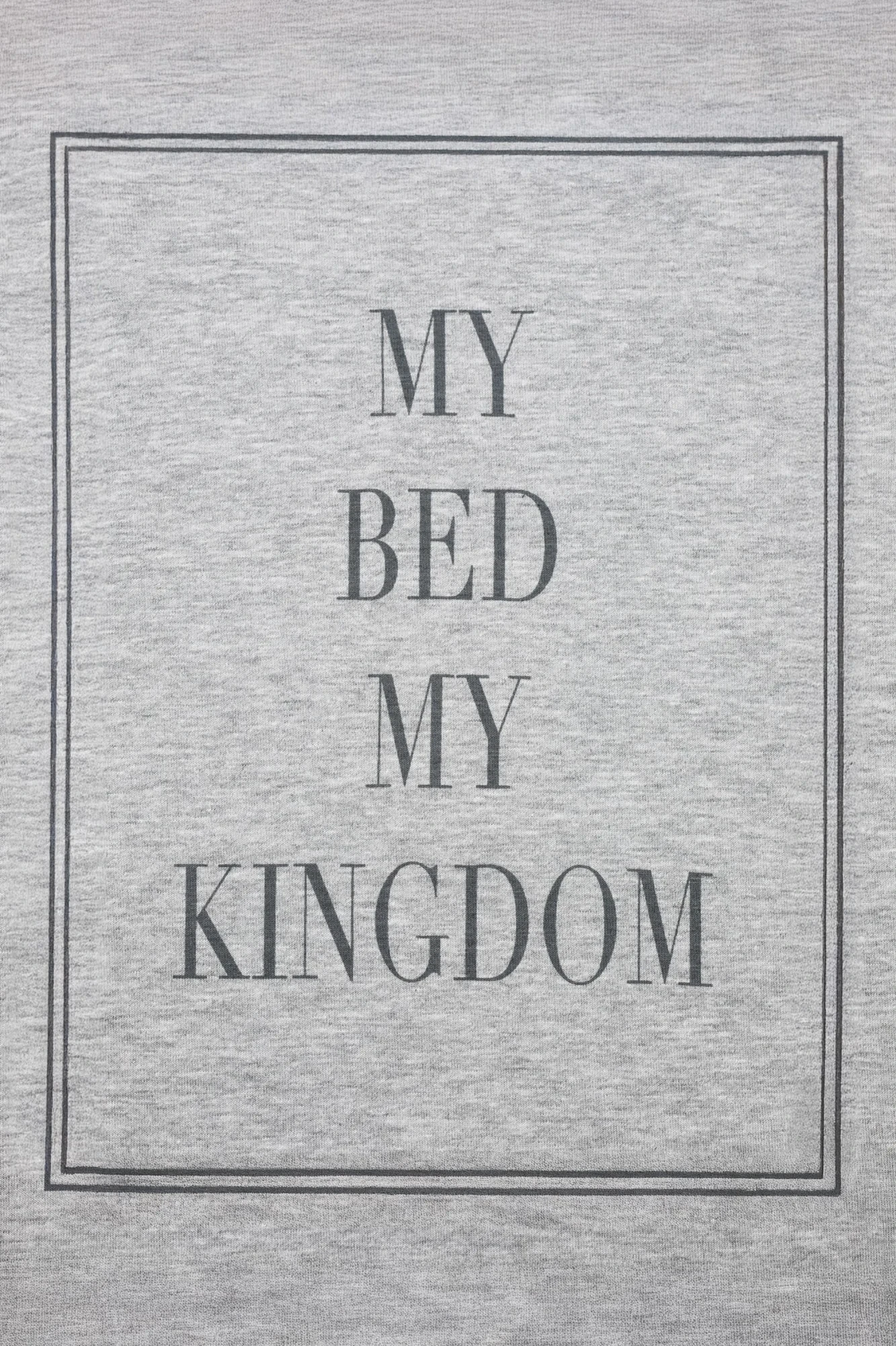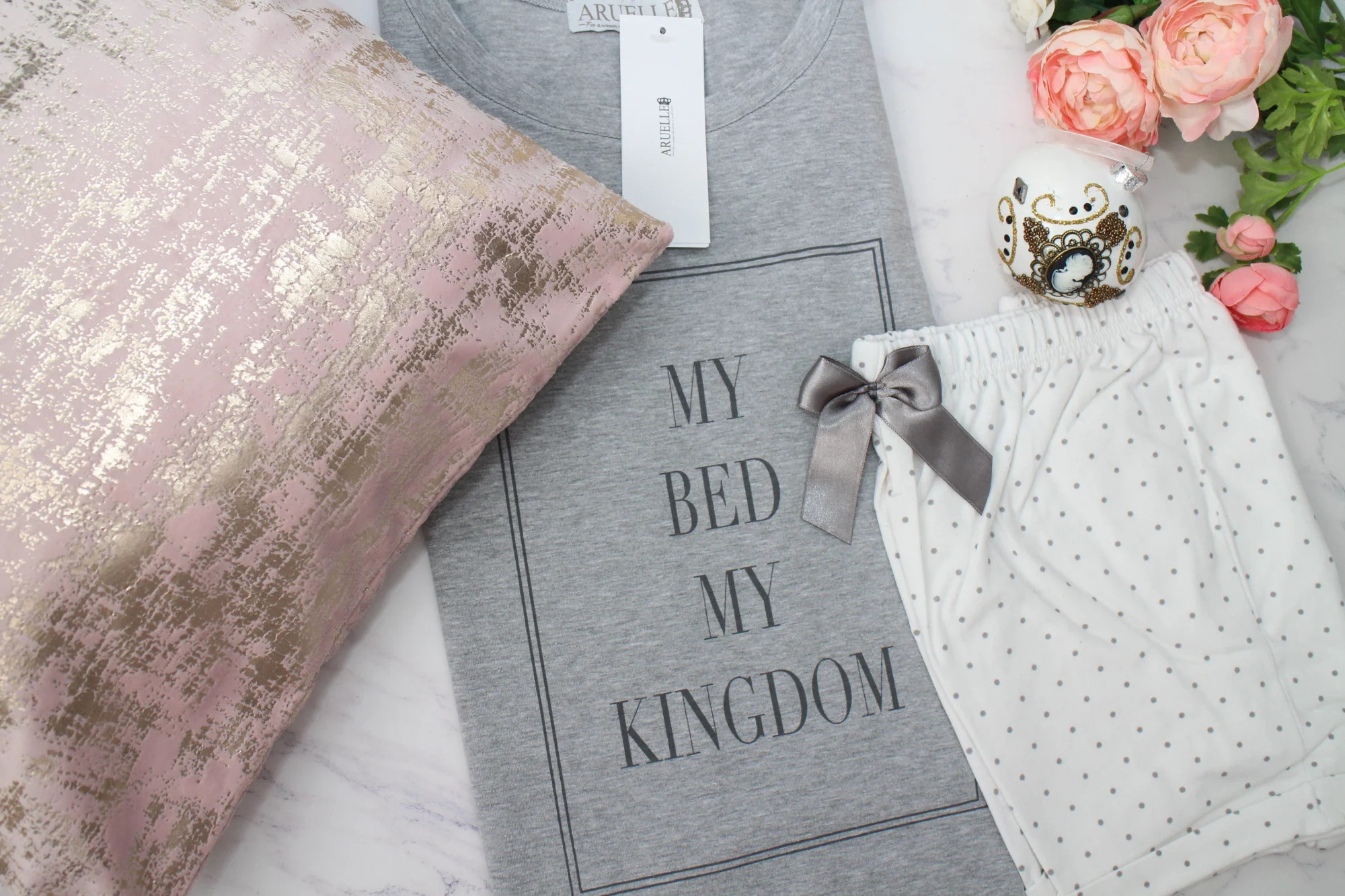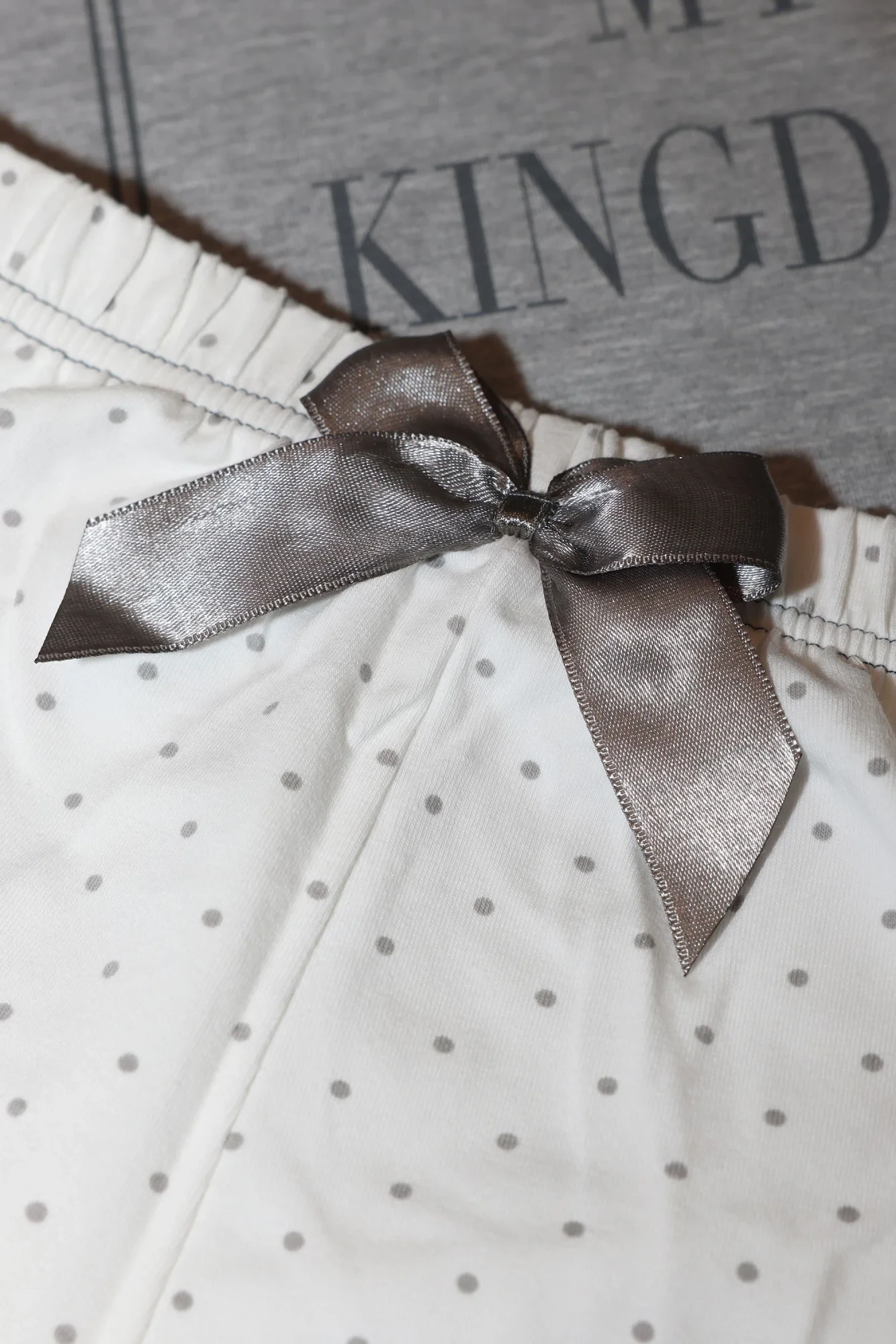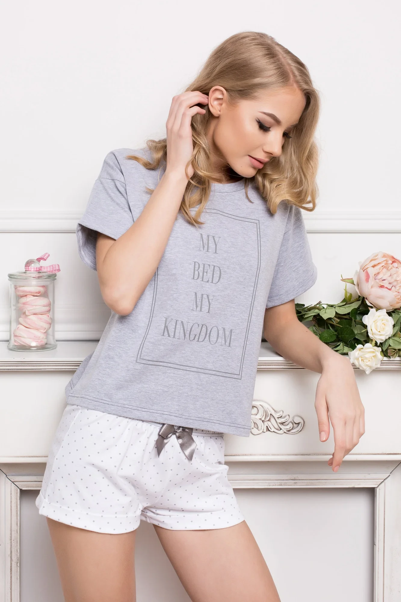 Krásné, velmi ženské dámské pyžamo v módním královském stylu. Bílošedá jemná bavlněná halenka s orámovaným nápisem "My Bed My Kingdom", doplněná světlými puntíkovanými šortkami se stříbrnou mašlí v pase. Ideální také jako dárek. Složení: 95 % bavlna, 5 % elastan.