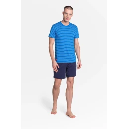 Pohodlné dvoudílné pánské pyžamo s tričkem v modré barvě, jemnými světlými proužky na látce a měkkým bavlněným úpletem. Nová kolekce značky Henderson, která kombinuje sportovní střih a nadčasový design. 100% bavlna.