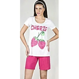 Pyžamo 9310 - Vamp. Dámské pyžamo s krátkým rukávem a kraťasy.Přední díl zdobený dvěma jahodami,nápisem a štrasem.