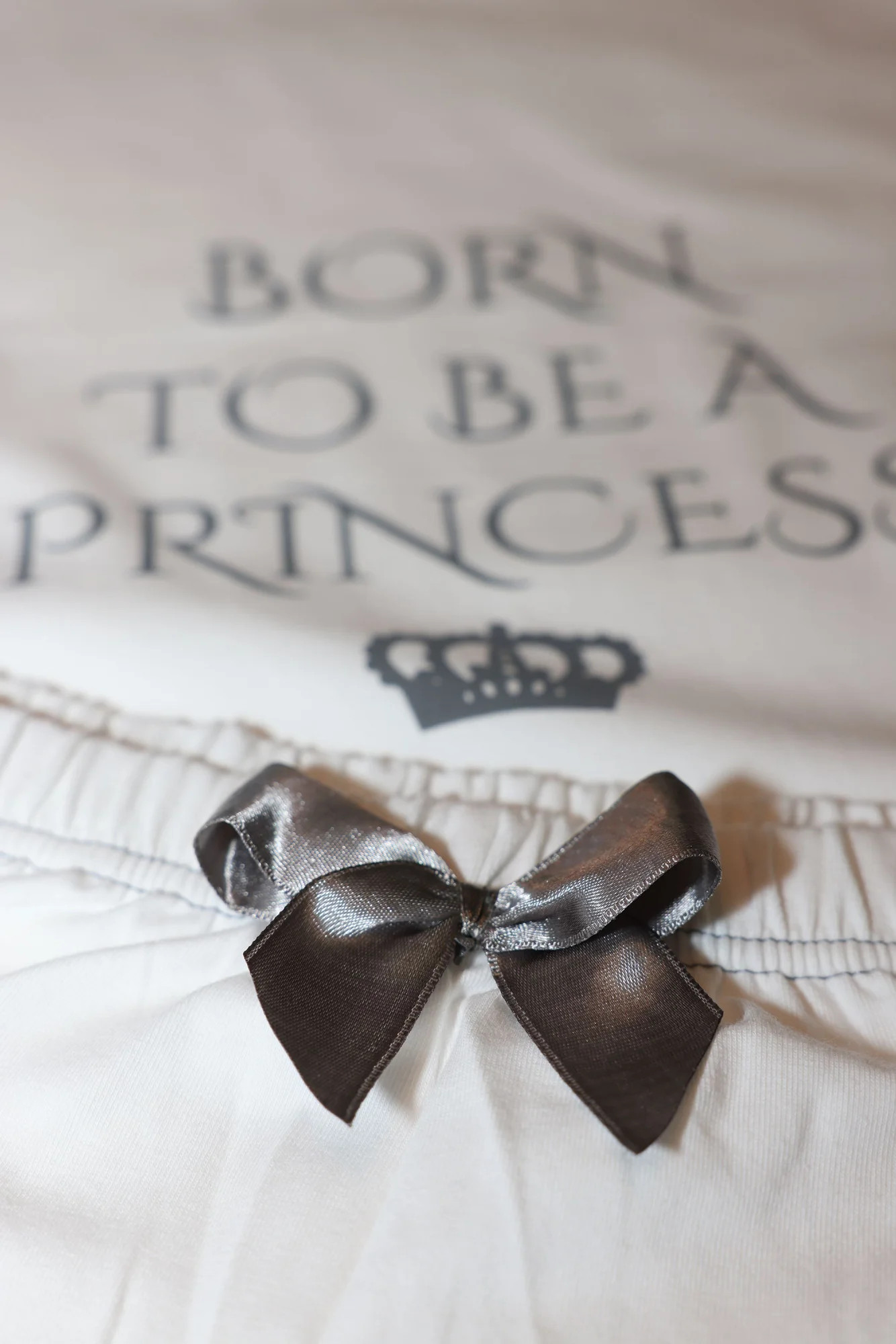 Jemné dvoudílné pyžamo Aruelle s motivem "Born to be a Princess". Bílá, měkká a příjemná na dotek. Vyrobeno z nejkvalitnější bavlny. Halenka s krátkými rukávy, lemovaná lemováním. Pohodlný střih, včetně šortek. Celý vzhled je sladký a ženský. Složení: 95% bavlna, 5% elastan.