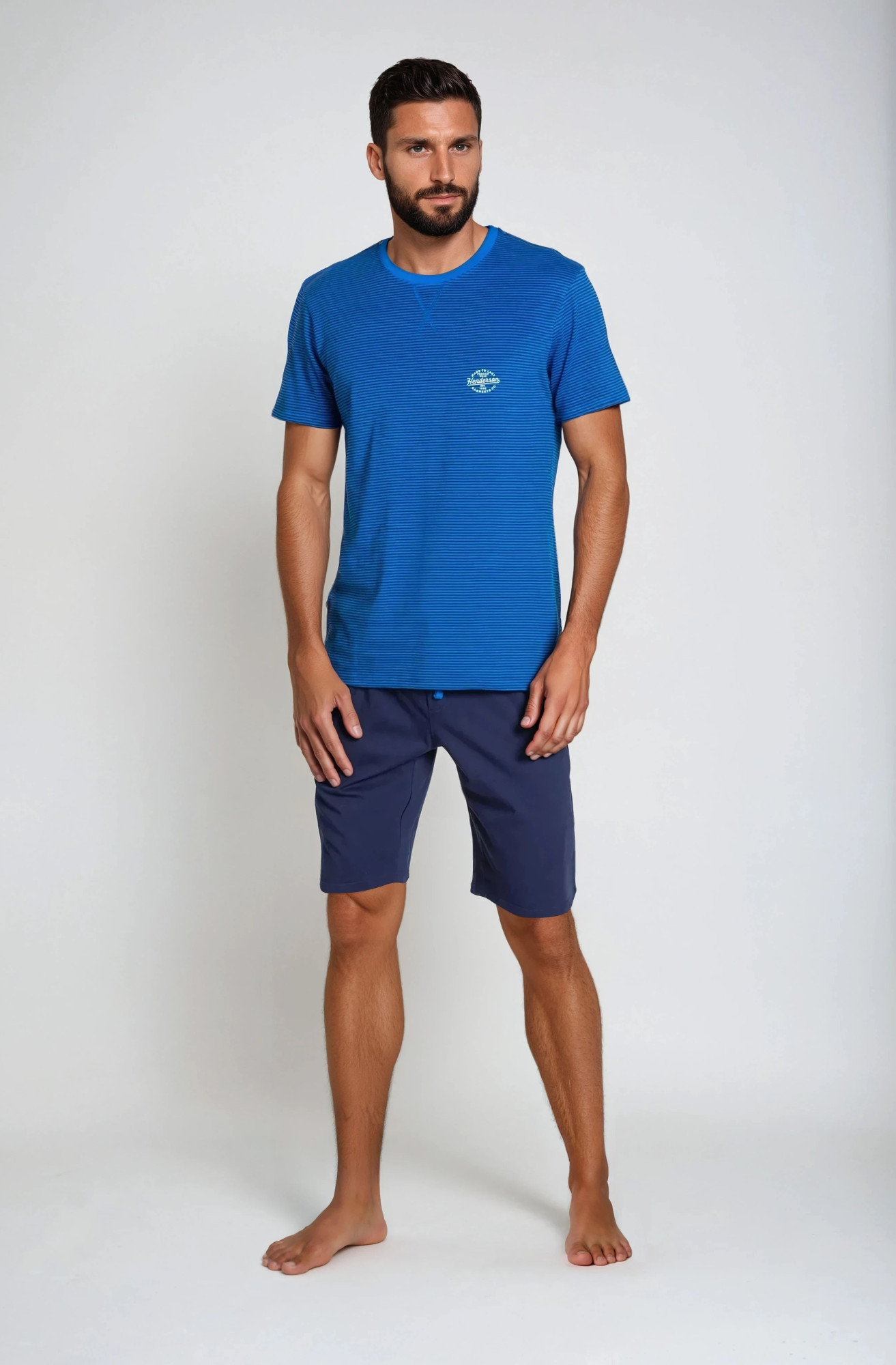 Mix barev založený na modrých tónech je univerzální záležitostí, ve které se bude cítit dobře prakticky každý muž. Drake - nejnovější pánské pyžamo značky Henderson sází na pohodlí a osvědčené barvy. Top v pěkném modrém odstínu, pruhovaný, s krátkými rukávy. Šortky po kolena. Složení: 100% bavlna.