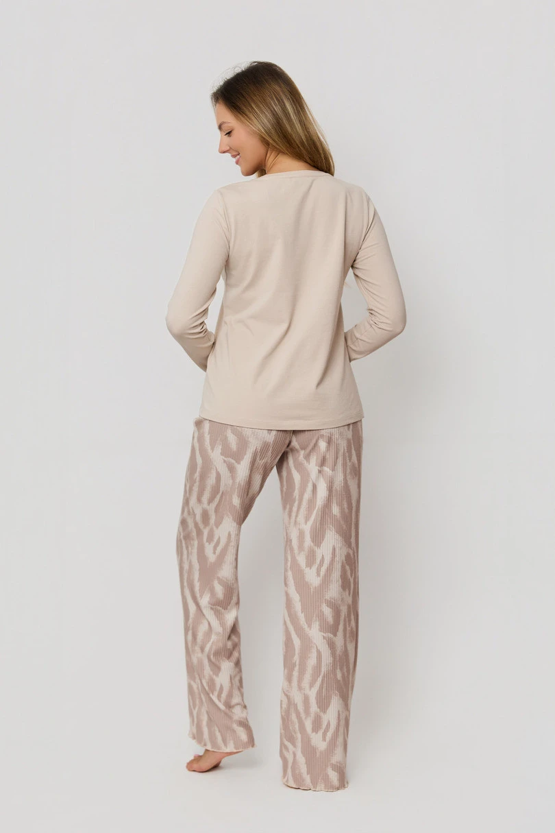 Odkryj komfort, który towarzyszy Ci przez całą noc — damska piżama z miękkiej, wysokogatunkowej dzianiny to idealny wybór dla kobiet ceniących wygodę i subtelną elegancję. Górę kompletu stanowi gładka koszulka z naturalnej bawełny, z długim rękawem i klasycznym, okrągłym dekoltem, gwarantująca pełną swobodę ruchów. Dół piżamy to długie, wzorzyste spodnie o modnym charakterze, wykonane z przyjemnego w dotyku materiału o wyraźnej prążkowanej strukturze. Dzięki połączeniu wiskozy, poliestru i elastanu spodnie są lekkie, elastyczne i doskonale układają się na sylwetce. Zestaw zapakowany jest w praktyczny foliowy worek — idealny na prezent lub podróż.
