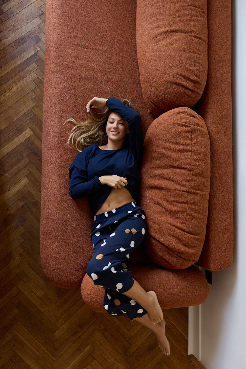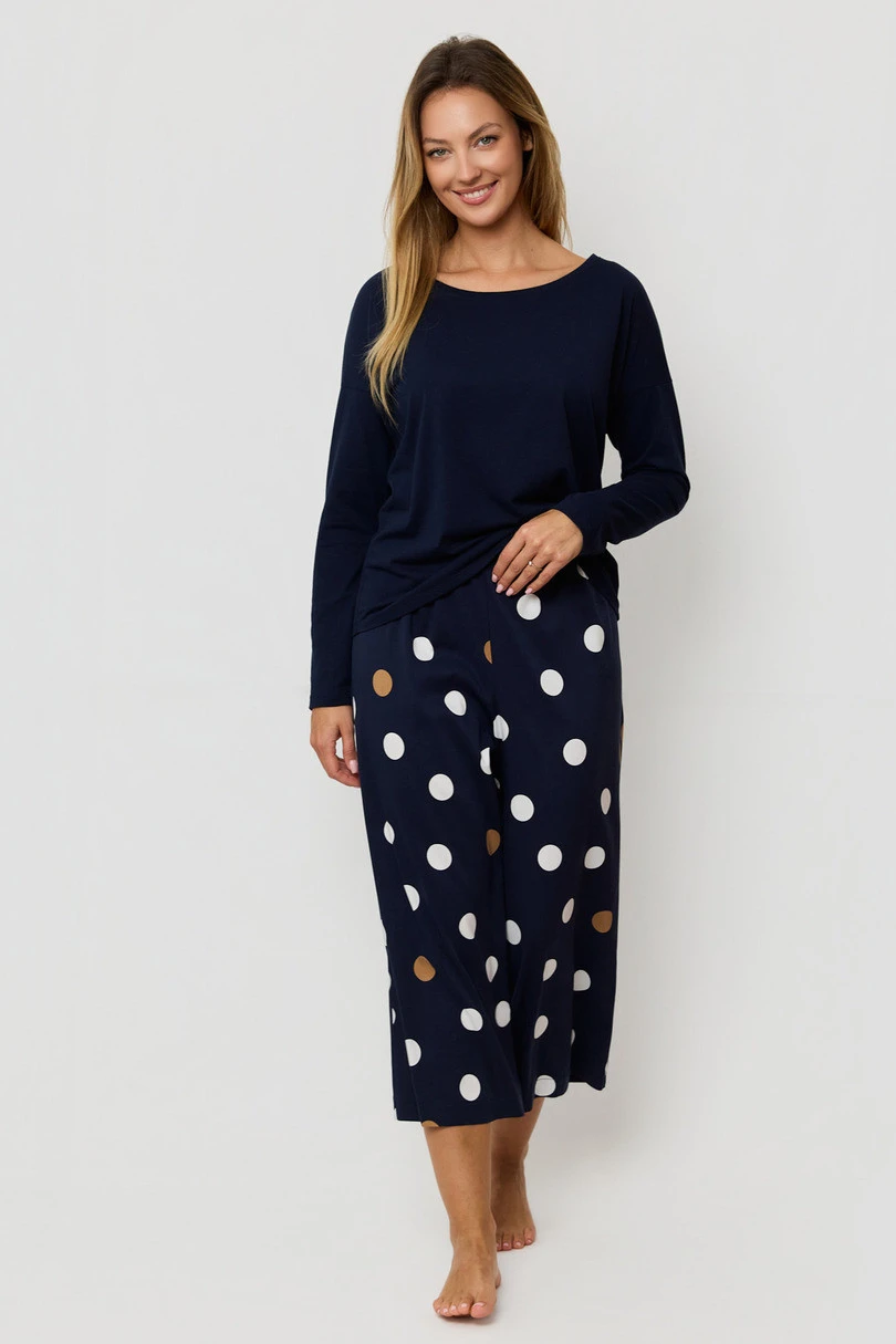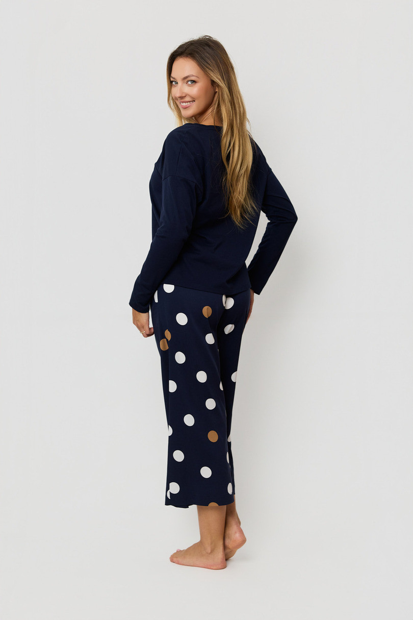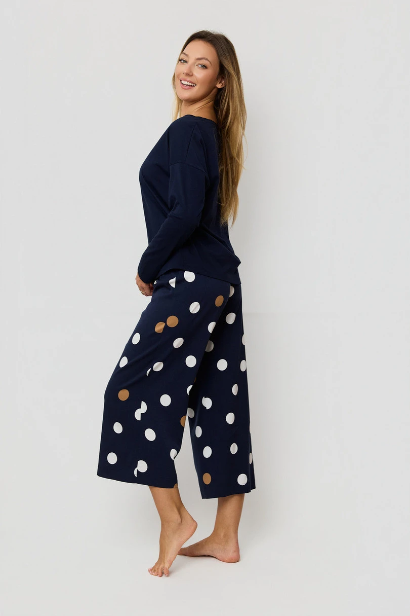 Stylowa i niezwykle wygodna piżama Oceane 7/8 to idealny wybór dla kobiet ceniących elegancję nawet w domowym wydaniu. Zestaw składa się z granatowej koszulki z długim rękawem oraz spodni 7/8 ozdobionych modnym wzorem w grochy. Wykonana z miękkiej, oddychającej tkaniny — wiskozy z dodatkiem elastanu — zapewnia pełen komfort i swobodę ruchów podczas snu i odpoczynku. Delikatny materiał doskonale układa się na sylwetce, a nowoczesny fason sprawia, że piżama wygląda niezwykle kobieco i stylowo.